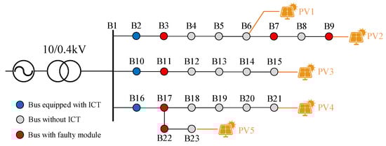 Low-voltage distribution grids (LVDGs) serve as the backbone of modern electrical distribution systems, forming the final link in the delivery of power to end-users. The growing integration of renewable energy sources (RES)—such as photovoltaic (PV) systems—has introduced increased complexity into LVDG operation [1,2]. This evolution underscores the critical importance of efficient and accurate fault location techniques to ensure grid reliability. Precise fault identification and location are essential for reducing outage durations, optimizing maintenance strategies, and enhancing overall system resilience, particularly as decentralized generation makes grid behavior more variable and less predictable.