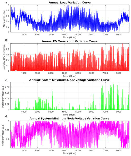 As shown in Figure 5, WC4 represents the dominant condition, accounting for 30.9% of the annual duration. It occurs primarily during spring and autumn and is characterized by moderate load and PV generation levels. In contrast, WC3 constitutes an edge condition, representing only 1.3% of the total time and typically corresponding to extreme weather scenarios. The remaining conditions—WC1 (17.9%), WC2 (17.8%), WC5 (19.3%), and WC6 (12.8%)—form a set of regular working conditions reflecting varying levels of PV generation and load demand throughout the year.