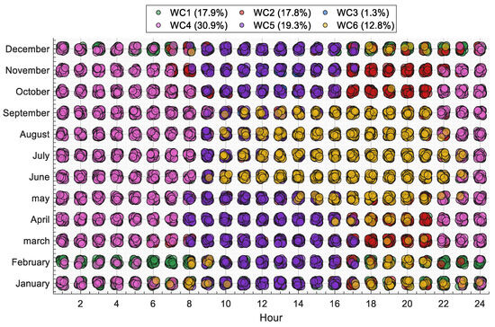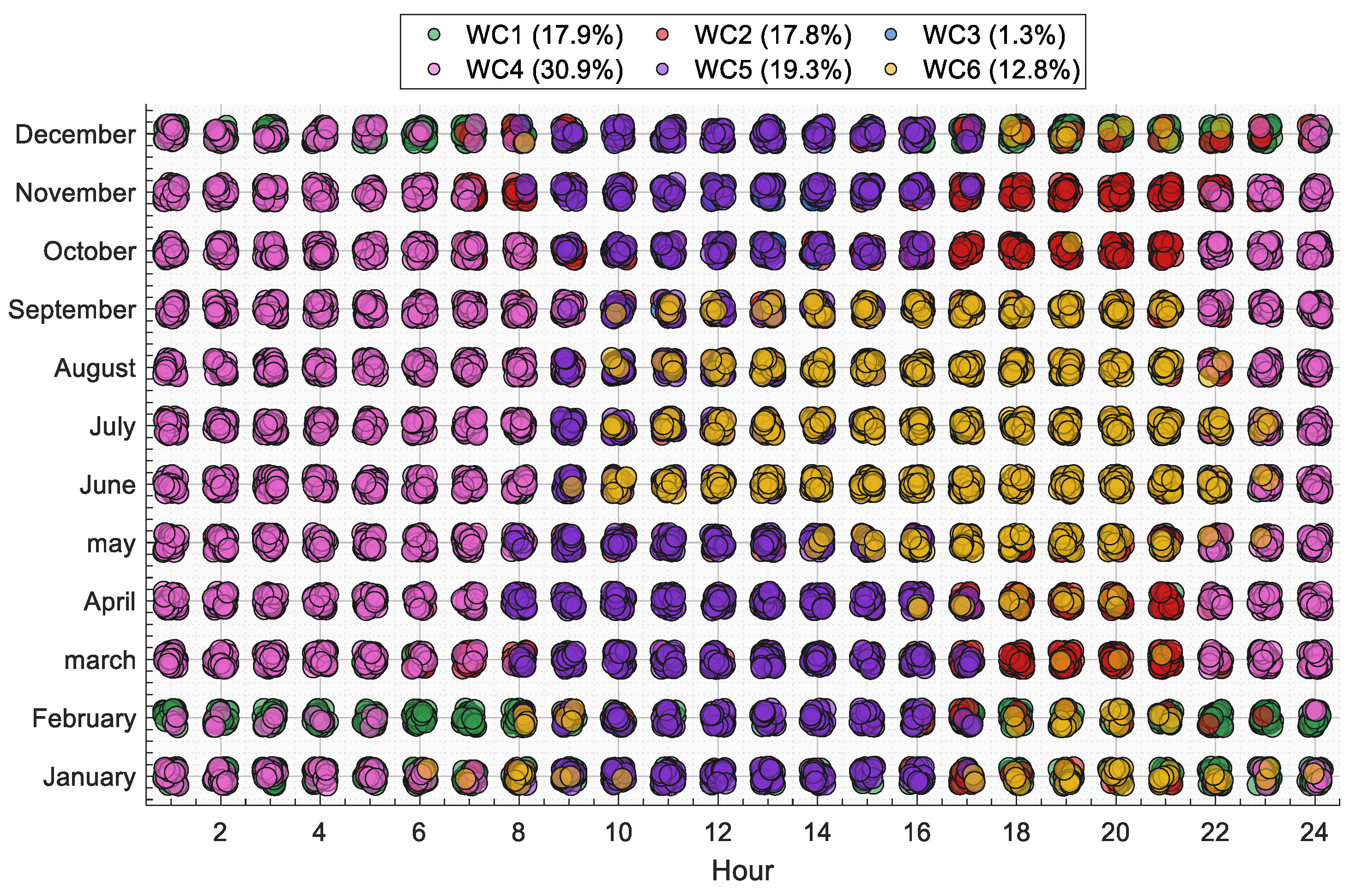 Temporal distribution of 6 identified working conditions (WC) throughout the year, displayed as a 12 ∗ 24 matrix (months × hours) with color-coded clusters: WC1 (17.9%), WC2 (17.8%), WC3 (1.3%, edge condition), WC4 (30.9%, dominant condition), WC5 (19.3%), and WC6 (12.8%).