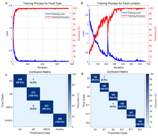 In contrast, S-transform-enhanced training (Figure 9) demonstrates superior performance across all metrics. Fault type classification reaches 99.72% accuracy, while fault location accuracy achieves 99.80%, representing a substantial 6.63 percentage point improvement. The confusion matrices reveal near-perfect diagonal dominance, with misclassification errors significantly reduced through enhanced spectral-temporal feature discrimination. The accelerated convergence and reduced training loss validate the effectiveness of time-frequency features in capturing fault-specific signatures that remain invisible in conventional amplitude-based analysis.
