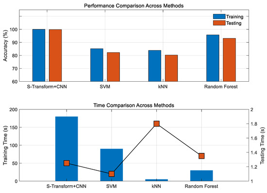 In addition, to verify the superiority of the proposed method among comparable approaches, several classical machine-learning models, including SVM, kNN, and random forest, were employed for comparison, and the results are shown in Figure 10. First, in terms of accuracy, the S-transform + CNN method achieves the highest training and testing accuracies of 99.99% and 99.80%, respectively, which are significantly higher than those of the baseline models. Among the traditional approaches, random forest performs best (95.77%/83.12%), followed by SVM (85.12%/82.23%), while kNN shows the lowest accuracy (83.85%/80.25%) due to its limited feature extraction capability. This indicates that conventional time-domain features, such as voltage amplitude alone, are insufficient for precise fault discrimination, whereas combining S-transform time-frequency representations with CNN learning markedly enhances fault-location accuracy and generalization ability. Second, the CNN model requires approximately 180 s for training due to deep network optimization, which is longer than the 2–90 s needed by the baseline models. However, all methods exhibit similar inference times of around 1.3 s. Considering that online operation only requires fast inference, the longer training time does not affect the method’s real-time applicability.