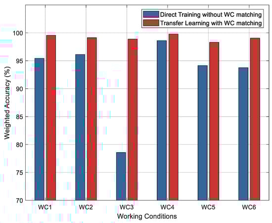 Comparative analysis of fault location accuracy between direct training without working condition matching (blue bars) and transfer learning with working condition matching (red bars) across six working conditions.