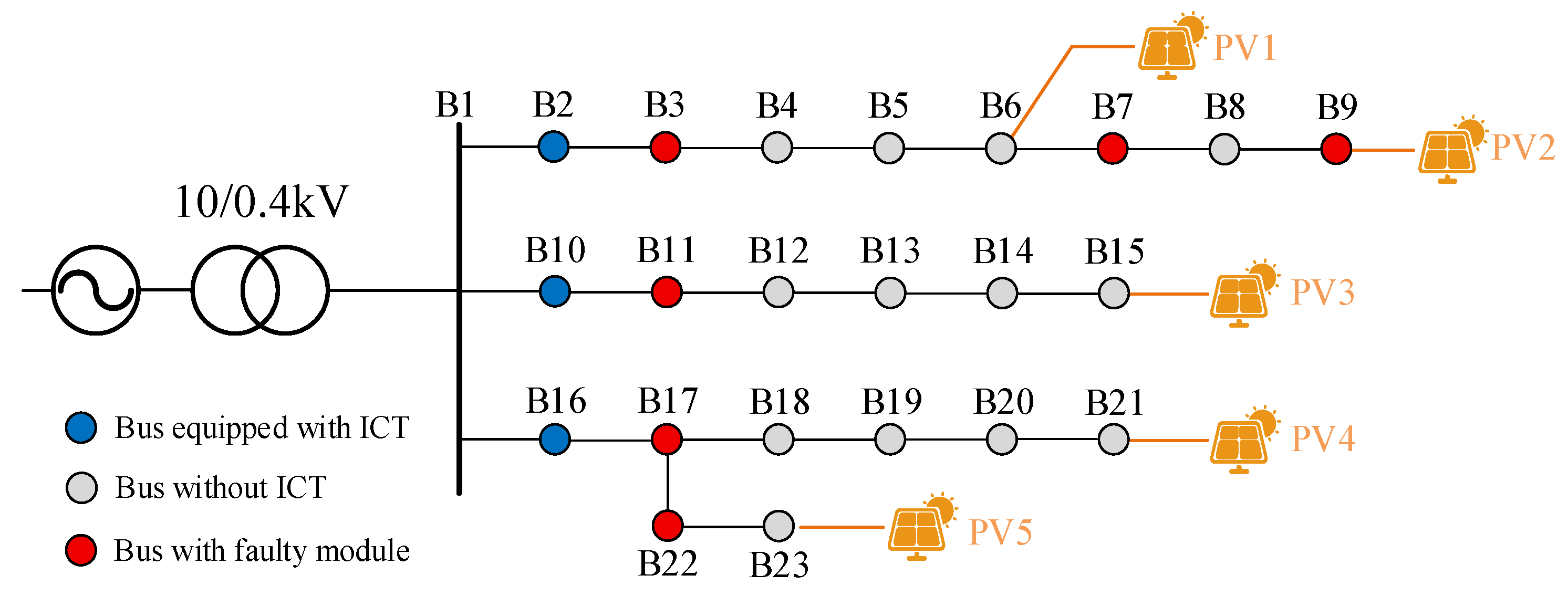 Topology of the 400 V LVDG test network with 23 buses, showing ICT deployment locations (B2, B10, B16), fault simulation modules (B3, B7, B9, B11, B17, B22), and distributed PV units (yellow symbols at B6, B9, B14, B21, B23).