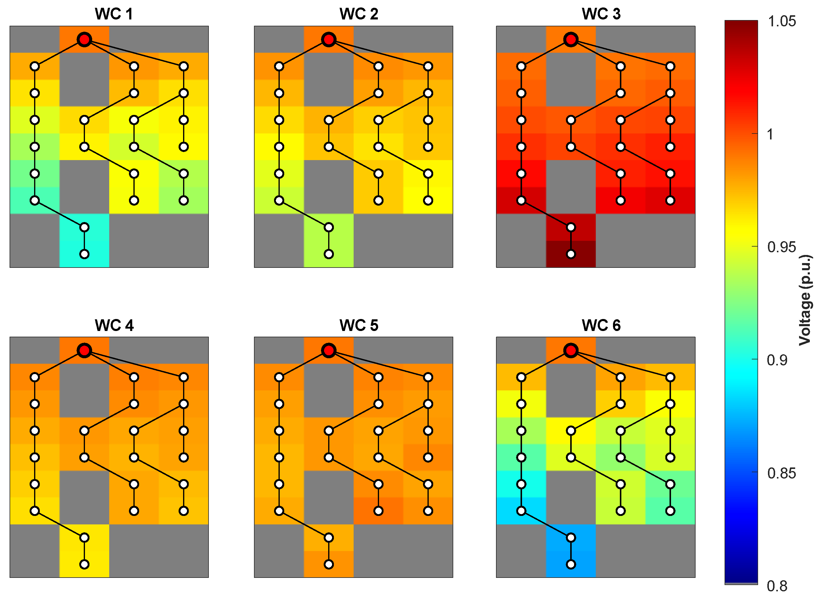 Spatial voltage distribution heatmaps across the six working conditions in the test network, showing per-unit voltage magnitudes at each bus location. Color gradients from blue (0.8 p.u.) to red (1.05 p.u.) represent voltage levels.