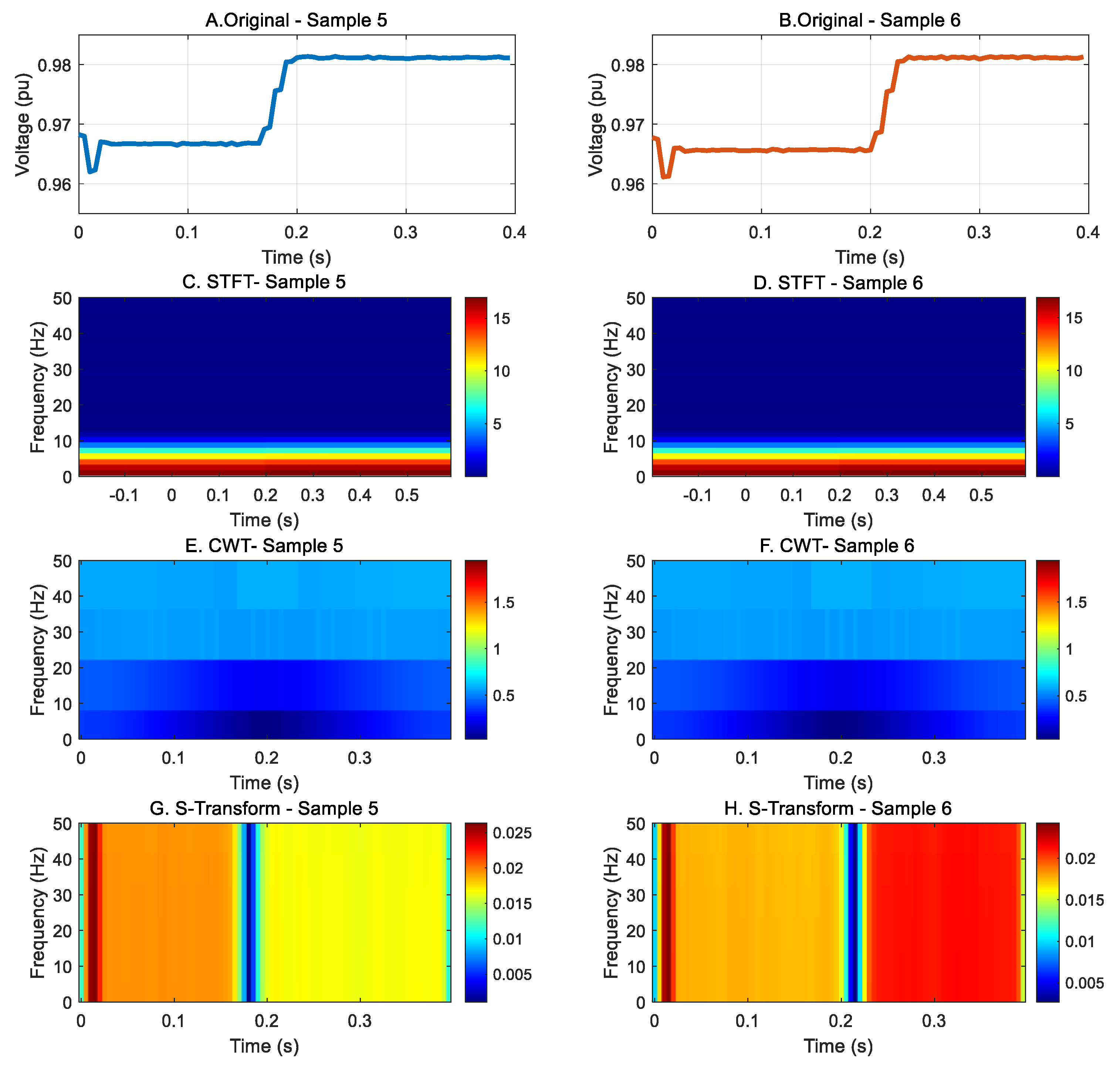 Comparison of A-phase ground-fault signatures at buses B17 (Sample 5) and B22 (Sample 6) observed from the ICT at bus B16: (A,B) original voltage waveforms, (C,D) STFT time-frequency maps, (E,F) CWT time-frequency maps, (G,H) S-transform time–frequency map.