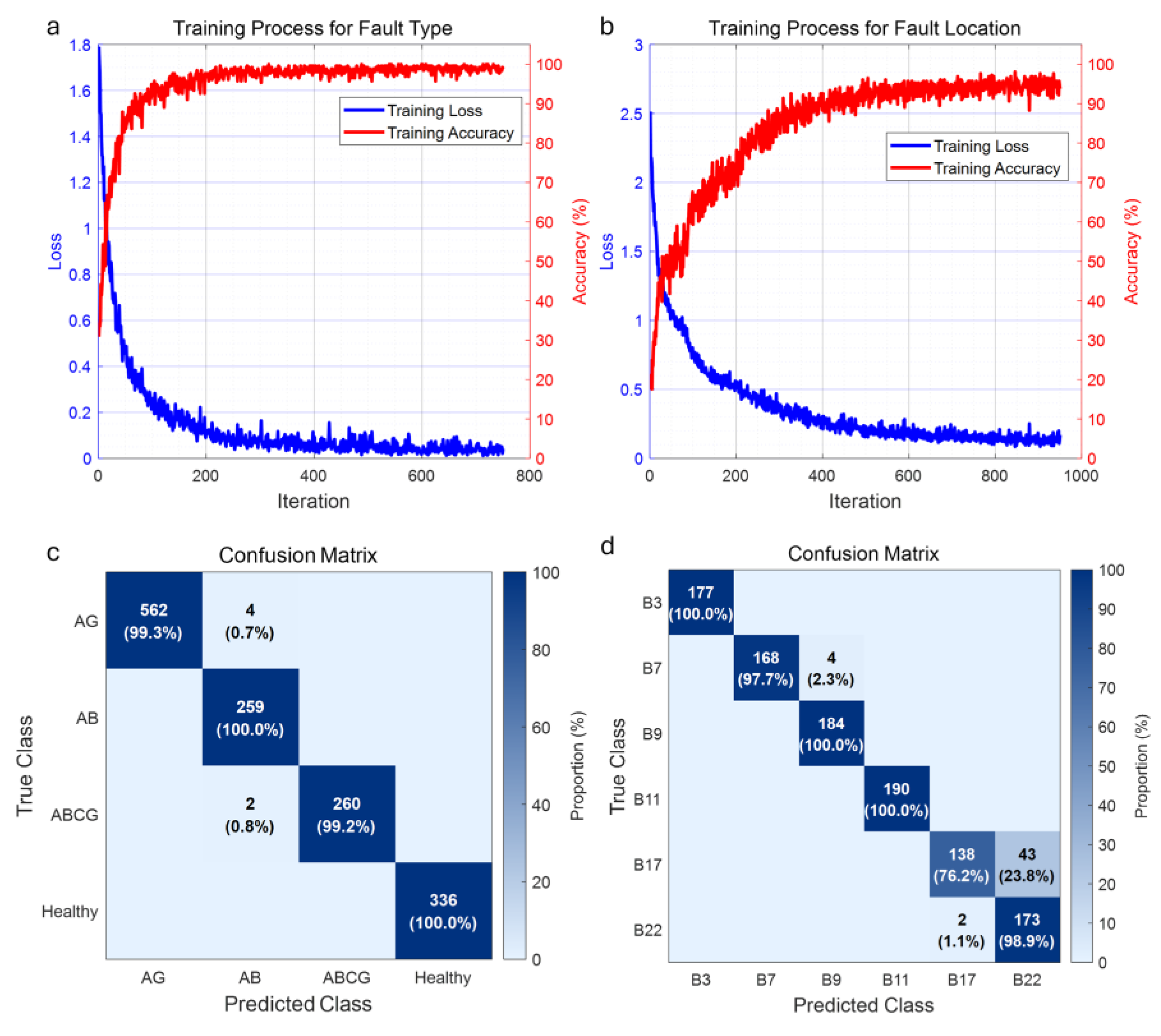 CNN training performance with S-transform enhancement: (a) Training curves for fault type classification showing accuracy (red) and loss (blue) evolution; (b) Training curves for fault location showing accuracy (red) and loss (blue) evolution; (c) Confusion matrix for fault type classification; (d) Confusion matrix for fault location.