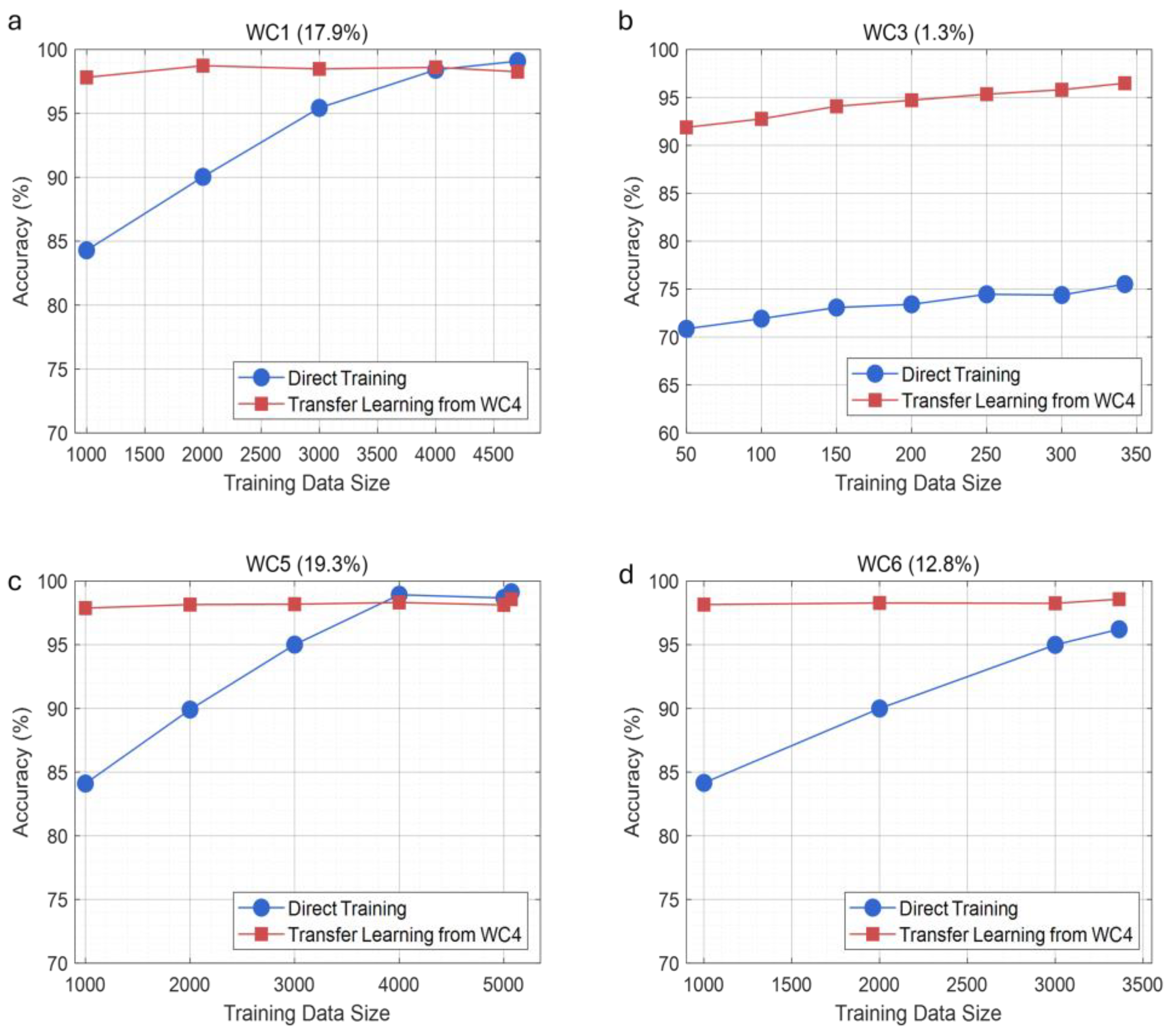Performance comparison between direct training and progressive transfer learning across different working conditions with varying training sample sizes. Four representative conditions are evaluated: (a) WC1 (17.9% samples); (b) WC3 (1.3% samples, edge condition); (c) WC5 (19.3% samples); (d) WC6 (12.8% samples).