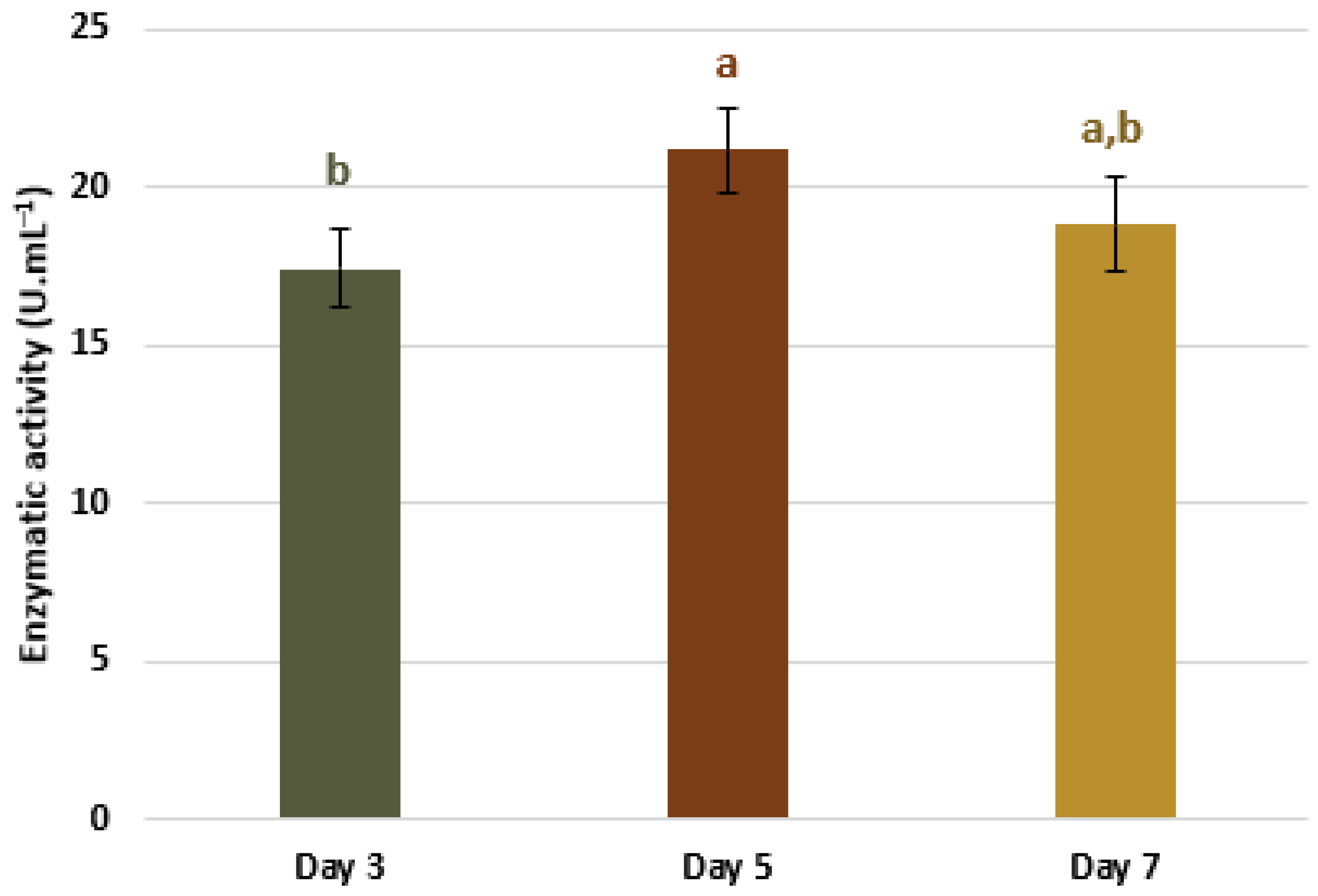 Figure 3. Mannanase production profile over 7 days of cultivation using coffee cake as a carbon source, with the initial medium described in Table 1, incubated in a shaker at 30 °C and 200 rpm. The comparison of mannanase activity between cultivation days was performed using a one-way ANOVA. Identical letters indicate no significant difference (p ≤ 0.05) between cultivation days for mannanase production, according to Tukey’s test.