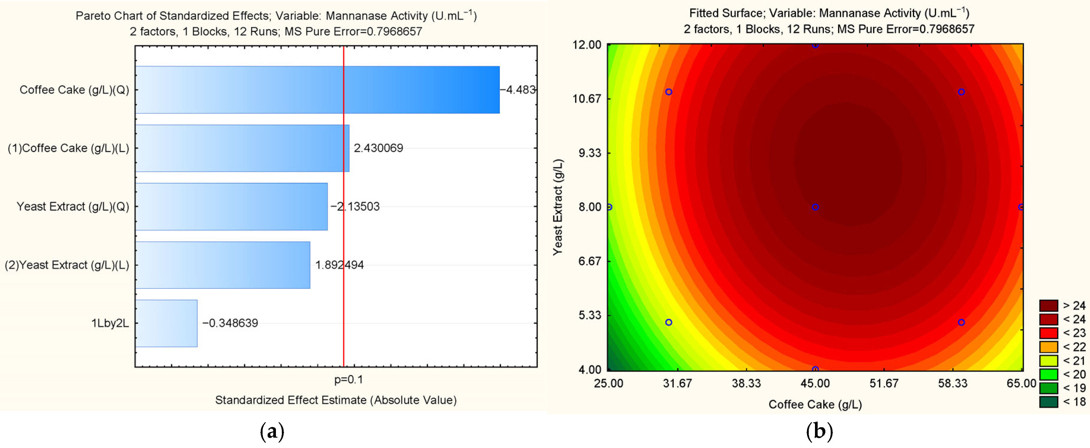 Figure 5. (a) Pareto chart of effects and (b) contour curves graph obtained through the two-factor CCRD conditions (coffee cake and yeast extract content) from culture medium for mannanase production (U·mL−1).