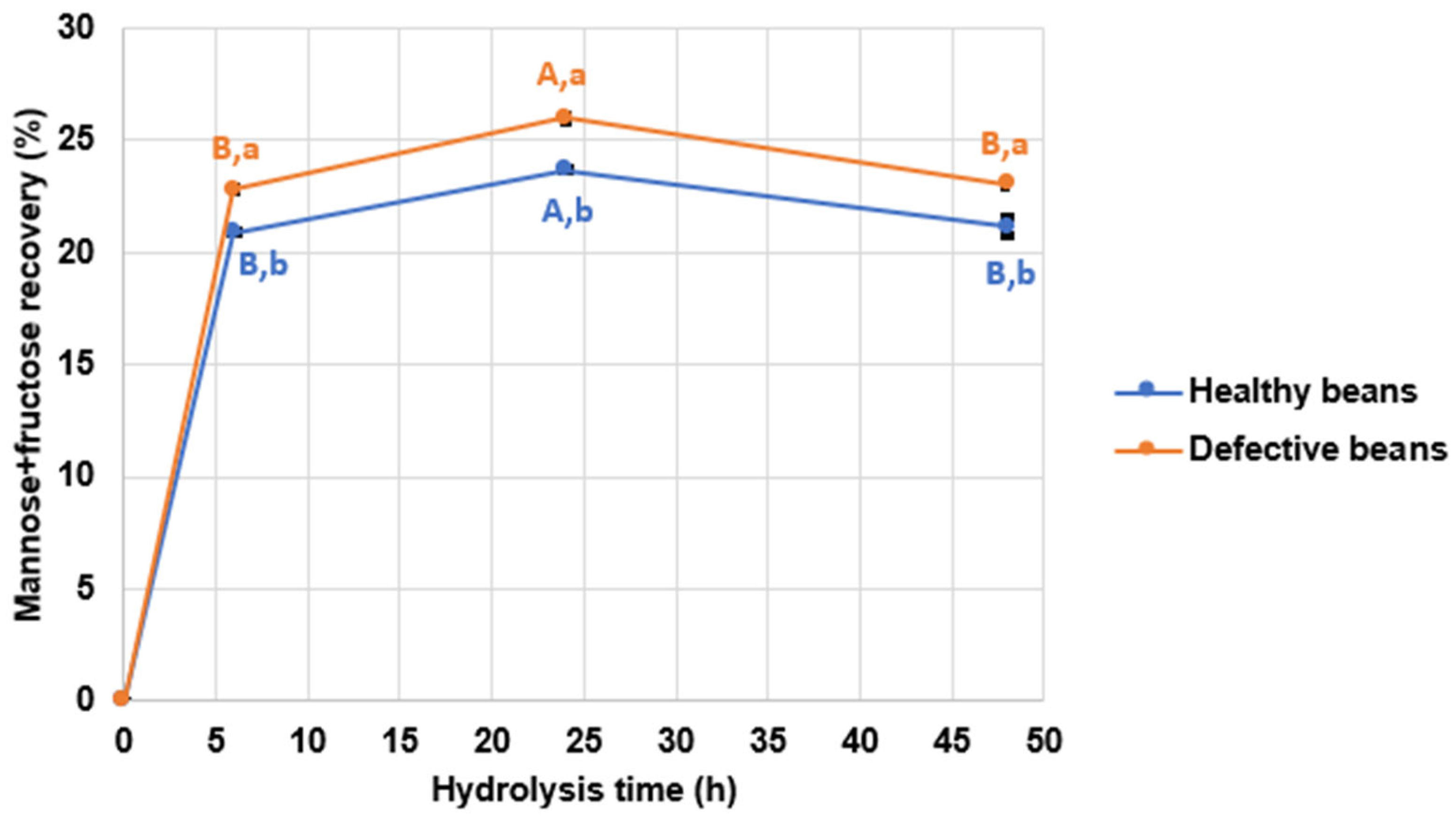 Figure 6. Mannose plus fructose recovery (%) obtained from the enzymatic hydrolysis of healthy and defective coffee beans at 50 °C and 250 rpm, using the optimized enzyme productized. The mannose value obtained by acid hydrolysis was considered 100%. The comparison of mannose + fructose recovery between cultivation days and between biomass was performed using a one-way ANOVA. Identical uppercase letters indicate no significant difference (p ≤ 0.05) between hydrolysis time, in the same biomass, for mannose recovery, according to Tukey’s test. Identical lowercase letters indicate no significant difference (p ≤ 0.05) between biomass, in the same hydrolysis time, for mannose recovery, according to Student’s t test.