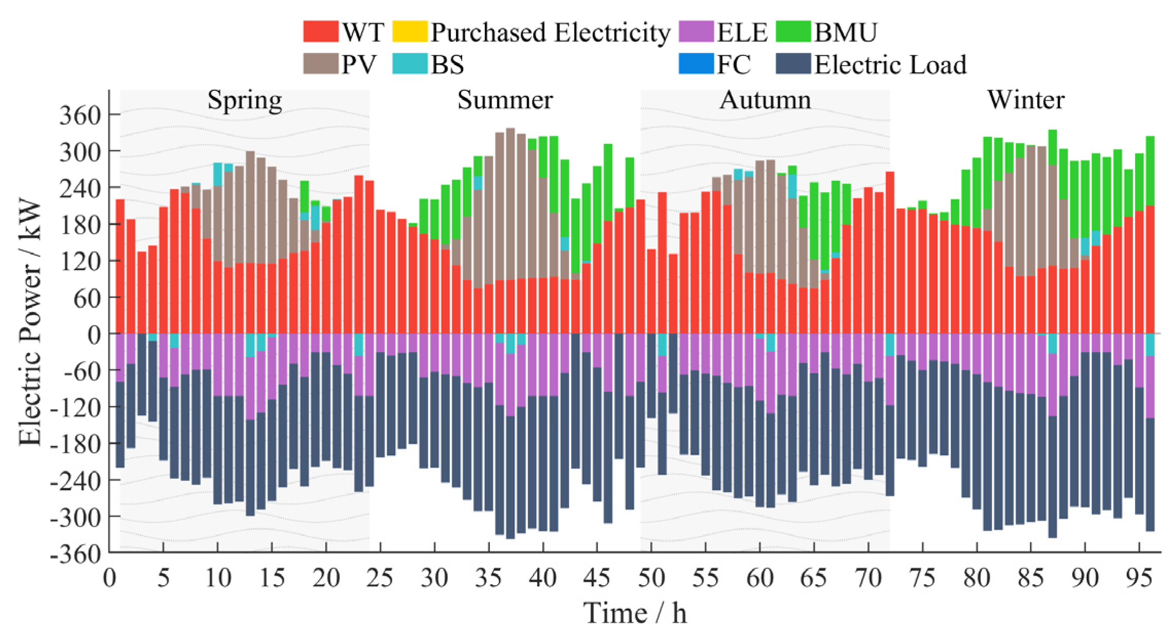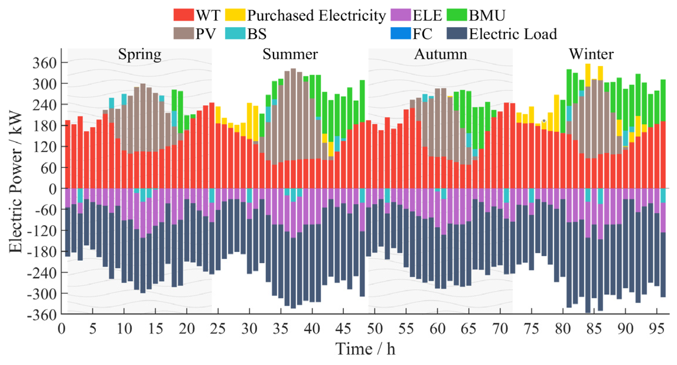 | The power of WT/PV/BMU/ELZ/FC/BS charge/BS discharge at time t | |
