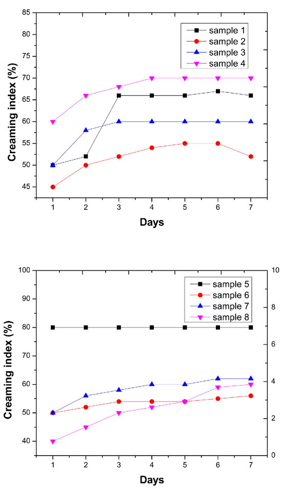 Creaming index values of the investigated emulsions are presented in Figure 2. The results showed that all samples exhibited a gradual increase in creaming index during the storage period, followed by a tendency toward stabilization at later days. For emulsions stabilized with sunflower meal fractions containing 15% protein (Samples 5–8), the highest CI values were observed for the fraction with the largest particle size (Sample 5), while smaller fractions (Samples 6–8) exhibited evidently lower CI values.