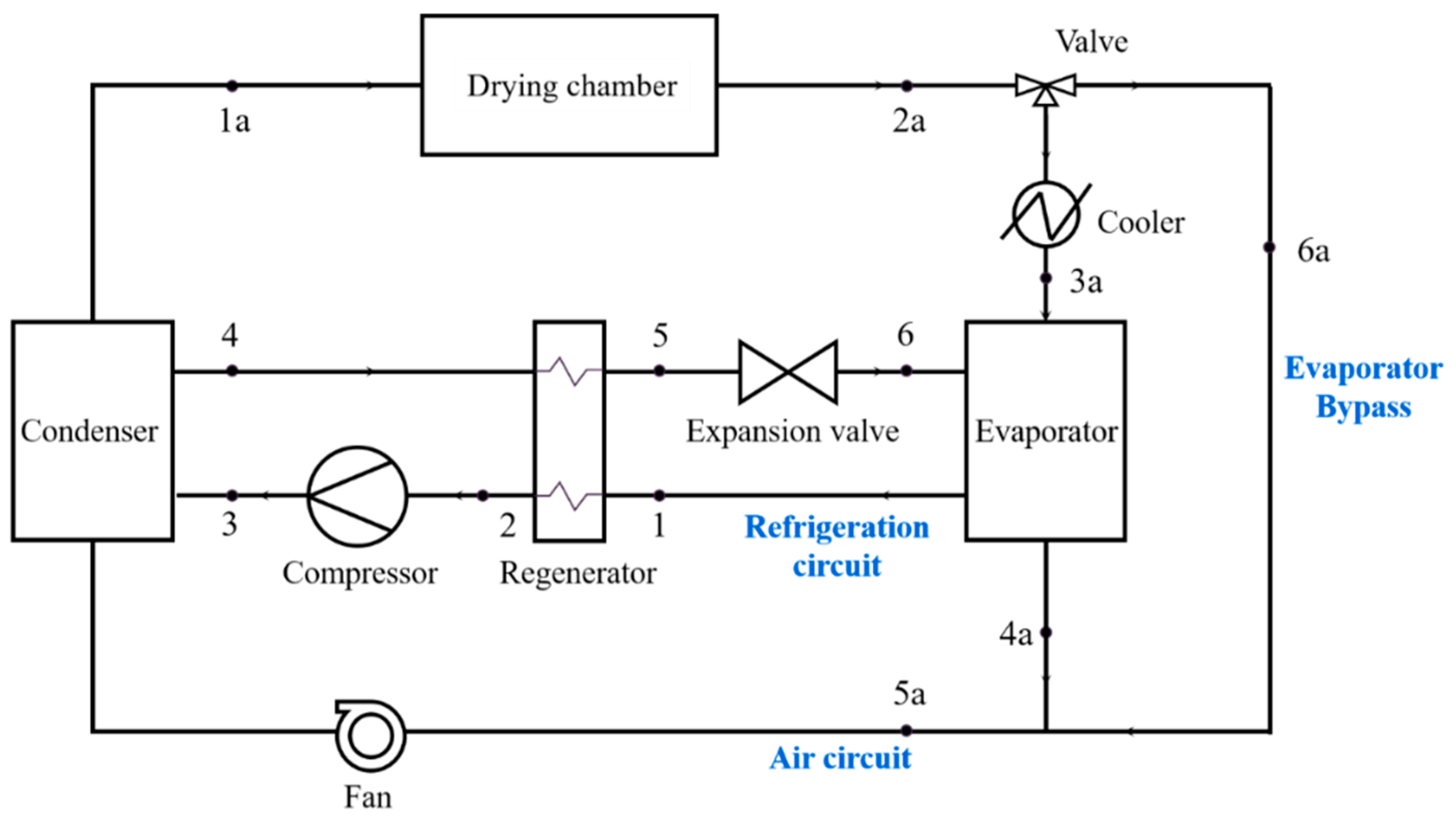 - Pressure drops in heat exchangers and heat losses in the drying chamber are neglected [27];