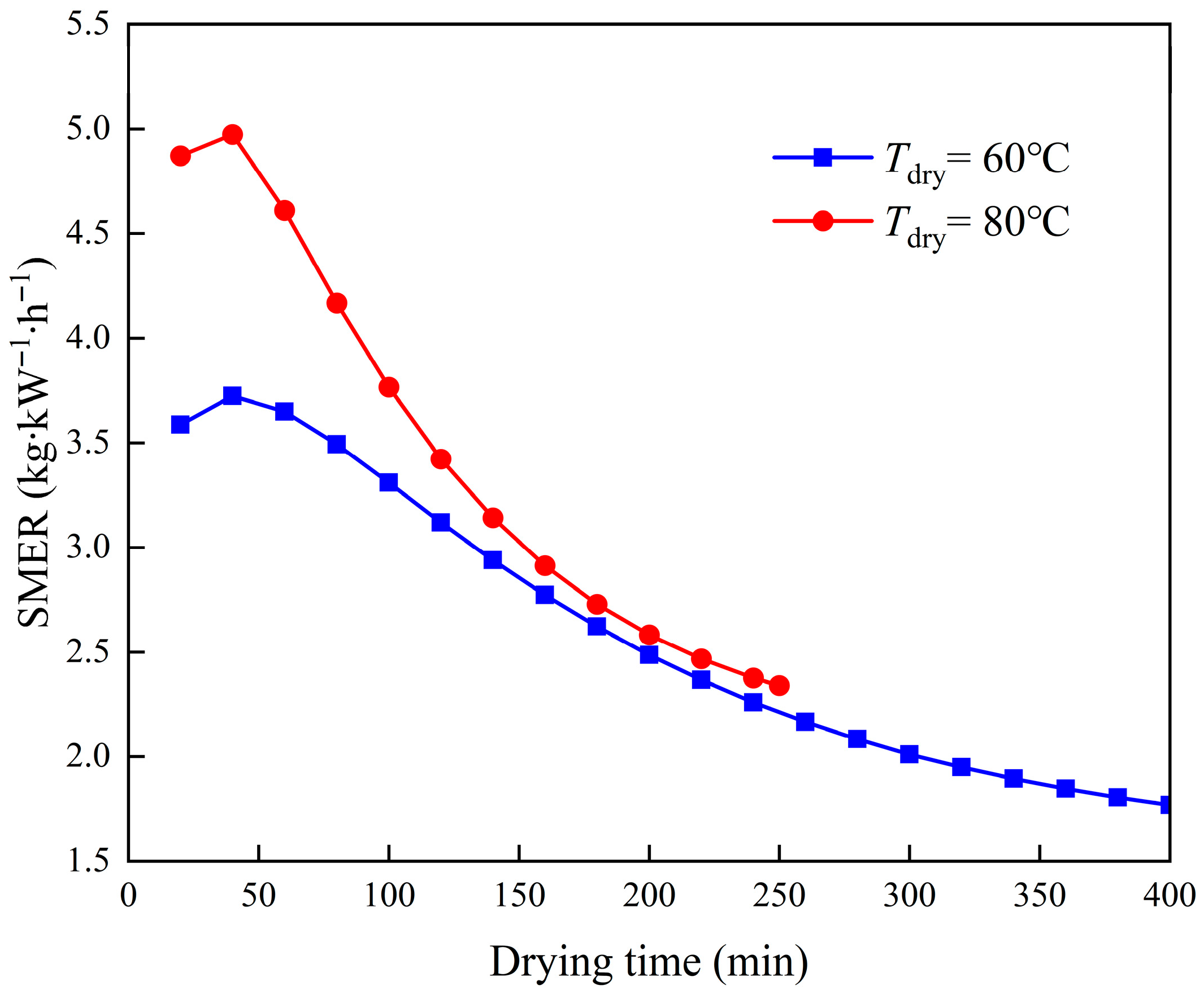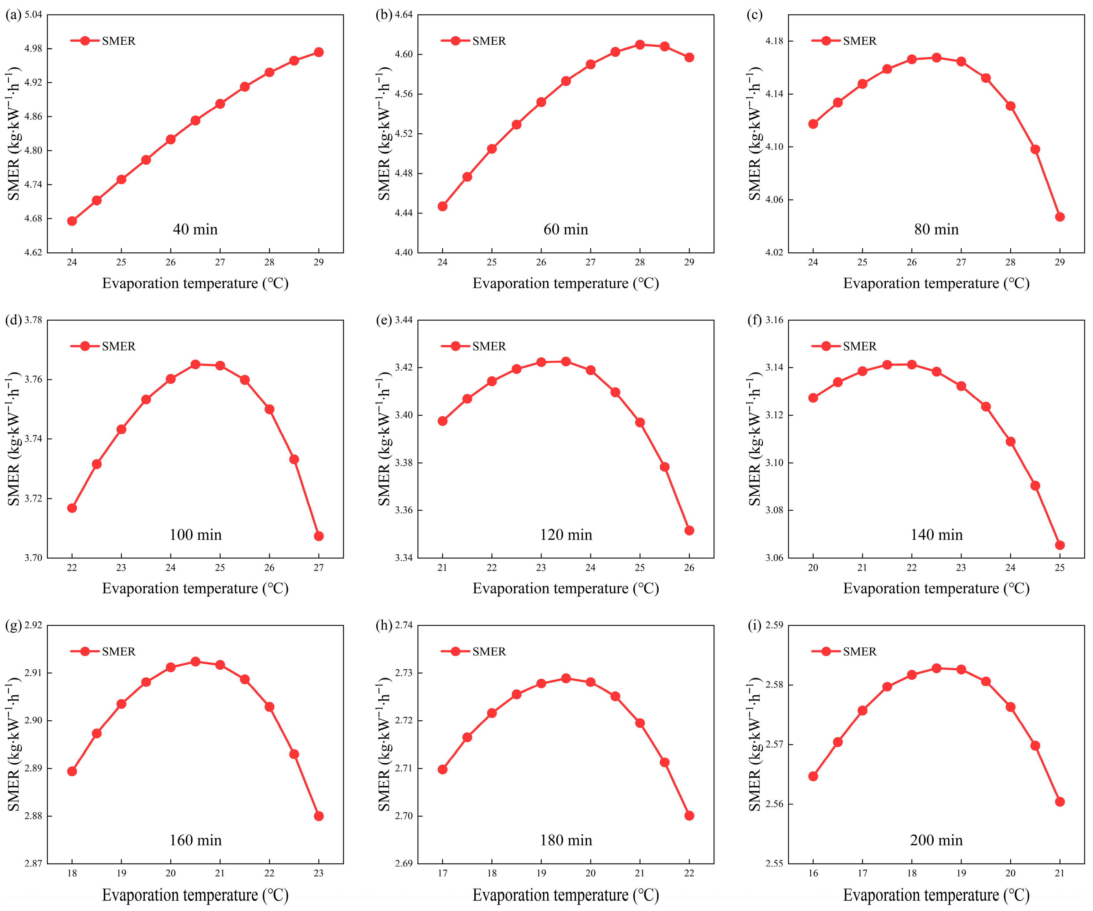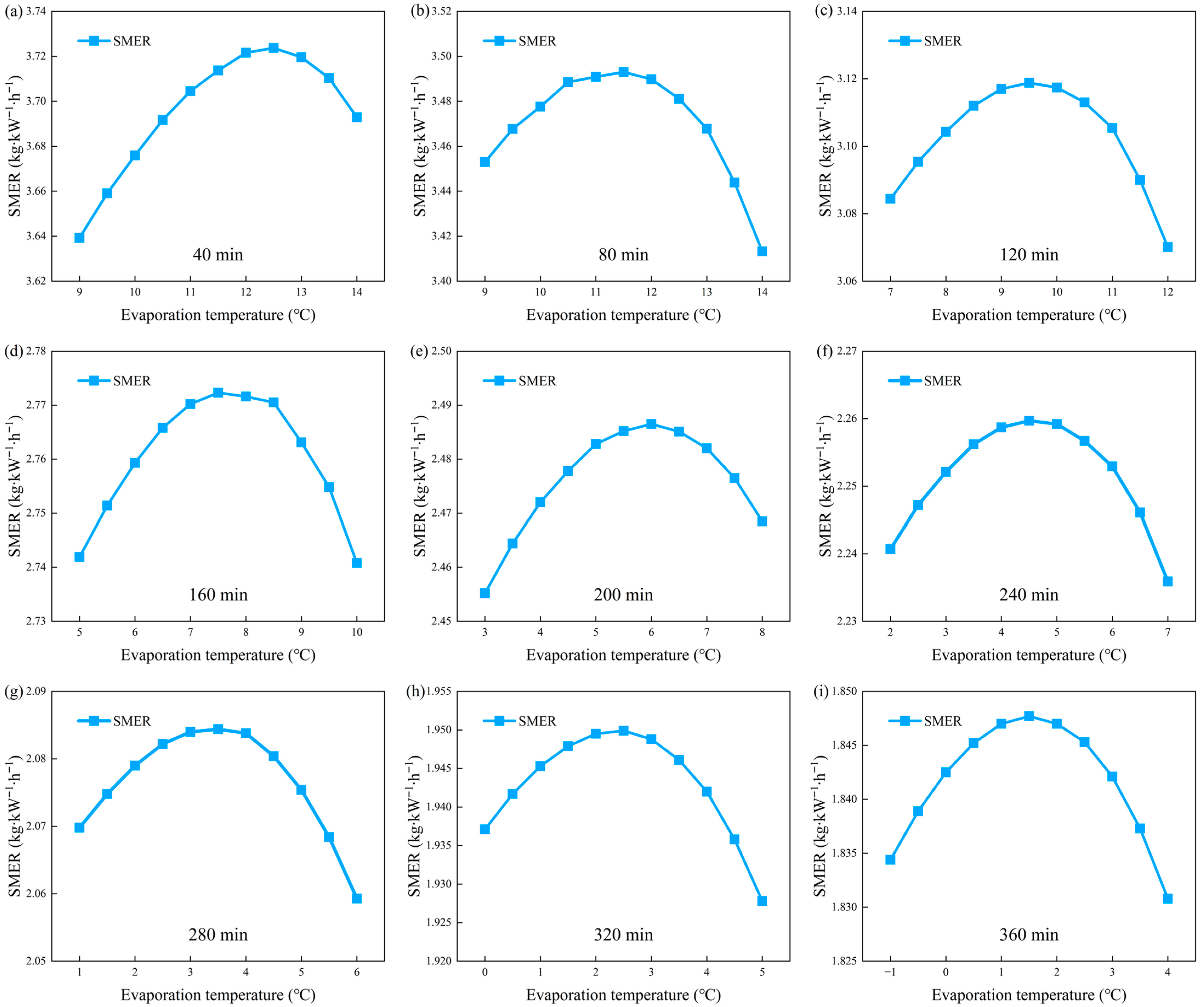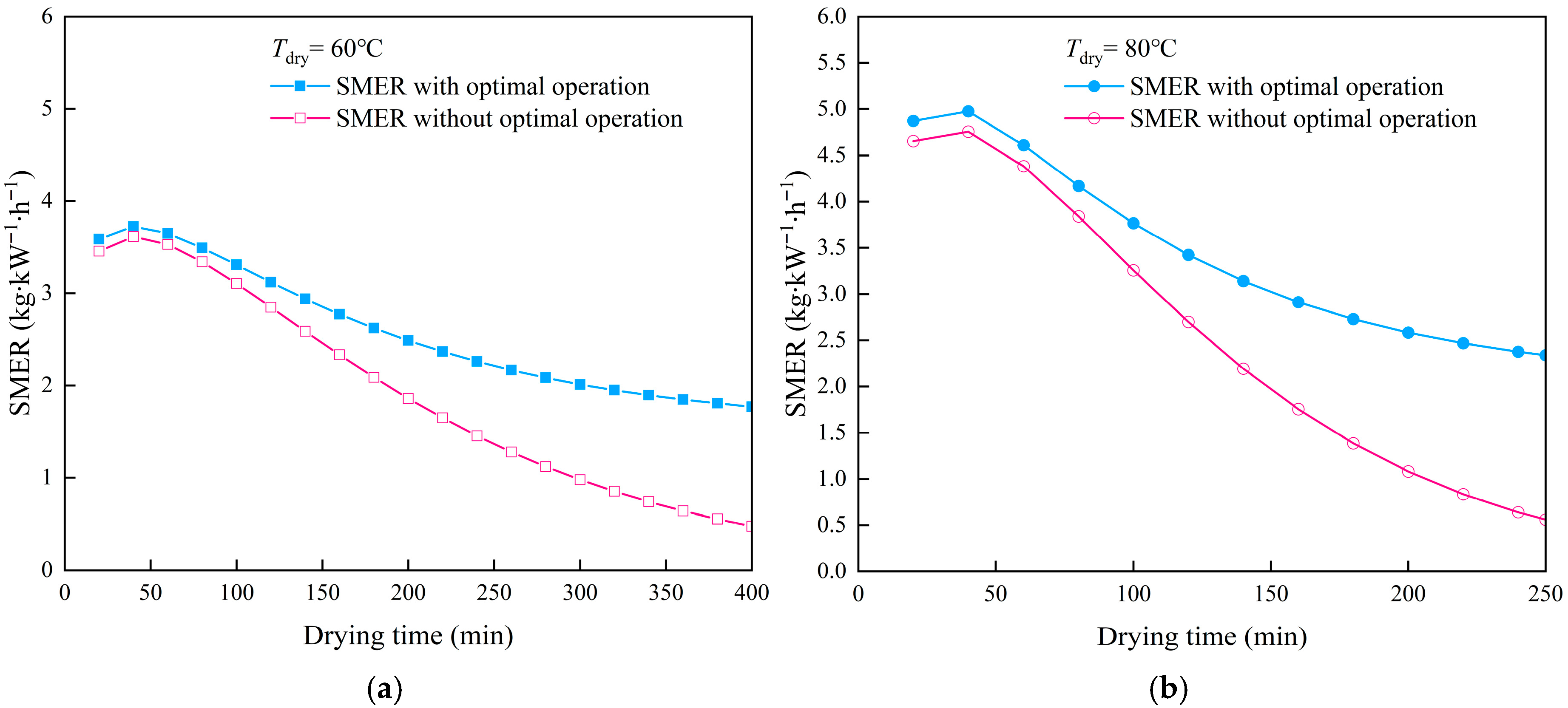 - Necessity of optimized operation: In practical applications, the HPD system often operates inefficiently due to the lack of dynamic control strategies. Dynamic control of the optimal evaporation temperature can significantly improve system performance, particularly in the later drying stages. Optimized operation effectively prevents a substantial decrease in SMER.