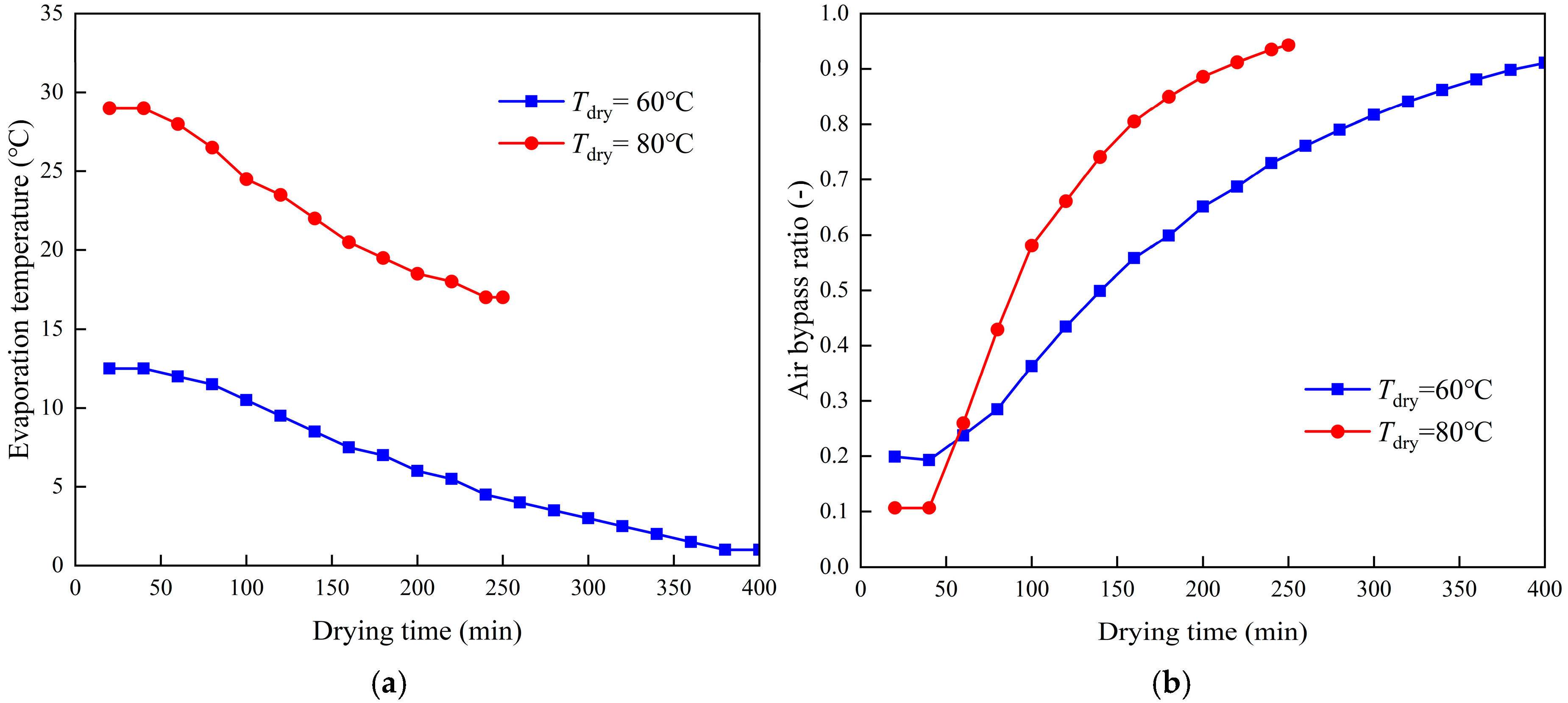 - Significant energy-saving effects: At drying temperatures of 60 °C and 80 °C, the HPD system with the optimized operating strategy reduced the total electrical consumption by 31.60% and 32.87%, respectively, compared to the constant evaporation temperature mode.