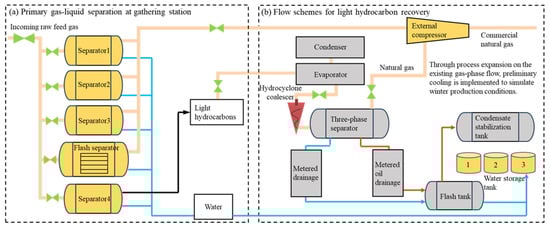 The process flow is illustrated in Figure 1. Incoming natural gas is first processed through a gas–liquid two-phase separator configured within the station for preliminary separation (Figure 1a). The gas subsequently enters a refrigeration unit, where it undergoes heat exchange with a cryogenic medium to complete the primary cooling process. This thermal treatment reduces the natural gas temperature to a cryogenic range of 4–5.5 °C. During this process, the light hydrocarbon components in the natural gas are cooled to undergo phase transition, condensation and separation. These components, along with condensed water, are directed into a three-phase separator. Under the gas-liquid–liquid three-phase separation mechanism, efficient separation of the gaseous phase, condensate oil phase, and aqueous phase is achieved. The separated gaseous phase is returned to the gas gathering station’s processing system, where it is pressurized by compressors and transmitted via pipelines. The aqueous phase is directed into the station’s blowdown system for the water treatment process, as shown in Figure 1b. The condensate oil phase then enters a condensate flash tank, where light components are removed through controlled pressure letdown. Then, it is then transferred to a condensate stabilization tank for storage. Current three-phase separators have demonstrated limitations in capturing light hydrocarbon components. They can only efficiently separate larger-diameter liquid-phase droplets and exhibit reduced capture efficiency for fine-diameter droplets.