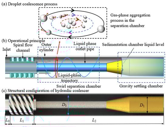 The structural configuration of the hydraulic coalescer and its operational principle are schematically illustrated in Figure 2. As seen in Figure 2b, the coalescer primarily consists of an inlet, spiral flow channel, inner tubular column, base cone, base conical column section, and outlet. During operation, natural gas and liquid phases are introduced through the inlet into the hydraulic coalescer. As the fluid traverses the spiral channel, its velocity gradually transitions from axial to tangential orientation, ultimately establishing a tangential swirling flow field at the spiral channel. Due to the density differential between the gas–liquid phases, the heavier liquid phase migrates radially outward from the central axis toward the peripheral wall under centrifugal force, and subsequently exhibits swirling motion around the separation column. During this process, dispersed droplets develop tangential, radial, and axial velocity gradients within the cyclonic field due to disparities in droplet size, spatial positioning, and migration trajectories. These velocity differentials induce inter-droplet collisions and coalescence, progressively aggregating fine droplets into larger ones. As shown in Figure 2a, centrifugal acceleration further propels the enlarged droplets toward the outer wall, where smaller droplets with diminished radial velocity undergo subsequent collisions and coalescence events. Ultimately, the coalesced liquid flow converges along the peripheral wall and discharges through the outlet [12].