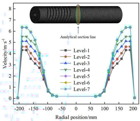 The fluid domain model of the cyclone coalescer was established, which included the inlet cavity, spiral flow channel, throat section and tail pipe section. Subsequently, mesh division was carried out, and a tetrahedral mesh was selected as the mesh type. The mesh division of the fluid domain and the local zoomed-in diagram are shown in Figure 3. Since the number of meshes affects the cycle time and accuracy of simulation computation, a mesh-independent validation was performed before the systematic structural optimization, to shorten the cycle time while guaranteeing the accuracy of computation. The mesh independence verification was conducted across five distinct grid refinement levels, with the mesh numbers as follows: Level-1 = 625,402, Level-2 = 815,231, Level-3 = 1,052,155, Level-4 = 1,262,442, and Level-5 = 1,443,561. Numerical simulations with the same initial conditions were conducted across models with varying mesh densities. The tangential velocity at a designated cross-sectional line of the separator was used as the evaluation metric to determine the critical number of mesh threshold. The results of the grid independence test are shown in Figure 4. When the number of grids increased to 1,052,155, there was no significant change in the tangential velocity at the separator’s cross-section. It was finally determined that the number of all model meshes in the subsequent processing was approximately 1,052,155.