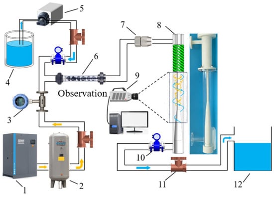 Test process flow chart. 1—Air compressor; 2—Air holder; 3—Gas flowmeter; 4—Water storage tank; 5—Peristaltic pump; 6—Static mixer; 7—High precision atomizing nozzle; 8—Hydraulic coalescer; 9—High speed camera; 10—Liquid flowmeter; 11—Valve; 12—Recovery tank.