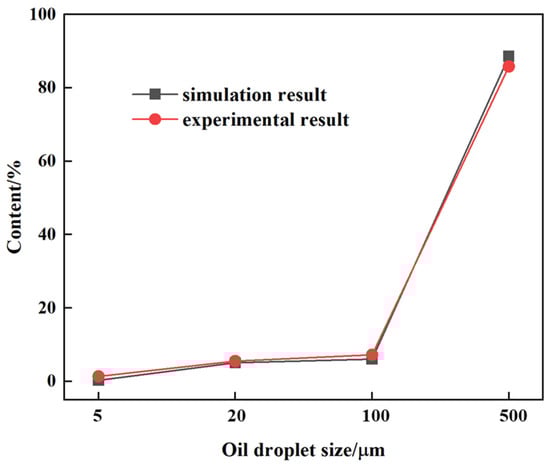 A comparison of the outlet droplet size distribution between experimental and simulation results under identical operating conditions is shown in Figure 6. The inlet droplet size distribution consisted of 92% 5 µm droplets, 5.5% 20 µm droplets, 1% 100 µm droplets, and 0.5% 500 µm droplets. The experimental results showed that after coalescence, the outlet droplet size distribution was as follows: 5 µm droplets accounted for 1.36%, 20 µm droplets for 5.53%, 100 µm droplets for 7.25%, and 500 µm droplets for 85.86%. Furthermore, the simulation results indicated that after coalescence, the outlet droplet size distribution was as follows: 5 µm droplets accounted for 0.28%, 20 µm droplets for 5.06%, 100 µm droplets for 6.05%, and 500 µm droplets for 88.61%. The experimental test results were in good agreement with the simulation results.