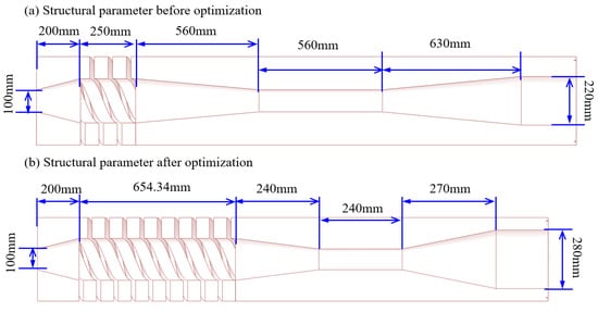 Partial differentiation was applied to the constructed mathematical model relating structural parameters to average droplet diameter using the least squares method. This enables identification of an optimal parameter configuration that maximizes the average droplet diameter, representing the optimization outcome of the RSM. The calculated optimal structural parameters were as follows: spiral flow channel length L1 = 654.34 mm, cyclonic chamber length L2 = 750 mm, and base column outer diameter D1 = 280 mm. The structural parameter differences between the original and optimized cyclonic coalescer configurations are illustrated in Figure 7. The extension of the spiral flow channel increases the droplet collision duration within the cyclonic field. The optimized length of the cyclone chamber ensures adequate coalescence space while maintaining structural compactness. The enlarged outer diameter of the base column reduces the outlet flow area, which decreases the axial velocity near the wall and extends the residence time of coalesced droplets, thereby facilitating their efficient discharge.