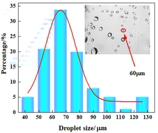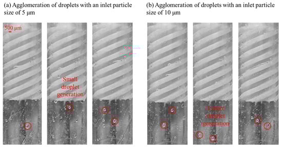 As seen from the high-speed imaging system results in Figure 8b, when the inlet droplet size was 10 µm, the majority of the droplets underwent collision-induced coalescence within the spiral flow channel, forming larger droplets of varying sizes. Notably, a significant proportion of the 10 µm droplets coalesced into larger droplets with diameters of approximately 60 µm; this size range enables highly efficient separation in three-phase separators. Additionally, some coalesced droplets exhibited diameters of approximately 100 µm.