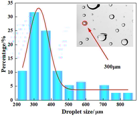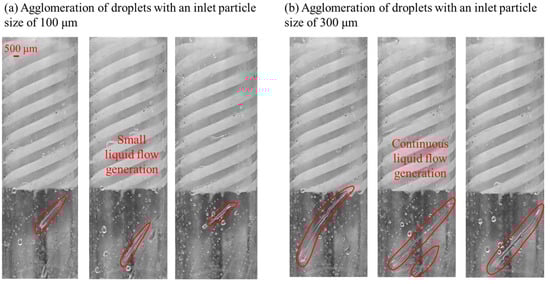 - When the size of the inlet droplet was 300 µm, some of the droplets collided and coalesced into large droplets with a size of 500 µm. Most of the large droplets formed a large surface liquid accumulation flow.