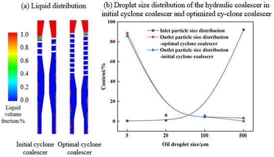 To further validate the enhanced efficiency of the optimized cyclonic coalescer, a numerical simulation study was conducted to comparatively evaluate the performance of both the original and optimized configurations under varying liquid phase volume fractions and droplet size distributions. The results are illustrated in Figure 12. The liquid phase distribution (Figure 12a) revealed that the optimized structure exhibited a larger flow distribution area compared to the initial design. This enhancement is attributed to the extended spiral flow channel, which generates intensified centrifugal forces, thereby improving the radial migration capability of oil droplets and amplifying their collision and coalescence efficiency. Analysis of the oil droplet size distribution in Figure 12b revealed that the optimized configuration achieved larger droplet diameters compared to the initial design. The extended spiral flow channel prolongs the cyclonic collision duration, while the enlarged base column outer diameter reduces the flow-through area at the outlet. These synergistic modifications effectively increase droplet collision frequency and enhance coalescence efficiency.