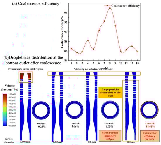 As seen from Figure 12b, the content of 5 µm small droplets at the inlet was 92%. After coalescence, the content of 5 µm droplets decreased to 3.28%, and the content of droplets larger than 500 µm at the outlet reached 85.81%. The coalescence effect of small droplets was relatively good. The central cylindrical portion of the cloud diagram represents the base conical column section. After optimized coalescence, the content of 5 µm droplets at the outlet was significantly reduced to 0.28%, and the content of droplets larger than 500 µm at the outlet reached 88.63%. The coalescence effect of small droplets was greatly improved compared to the initial structure.