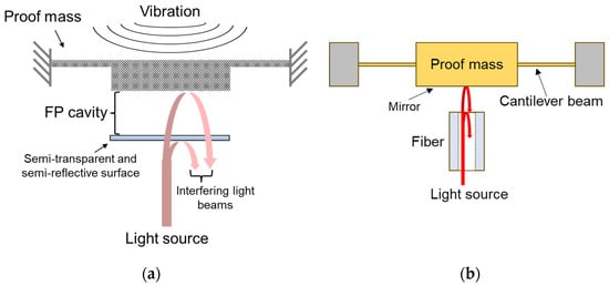 The vibration identification method is an efficient pipeline abnormality detection method. When there is pipeline vibration caused by human factors or external natural factors, an irregular external disturbance will be superimposed on the original regular internal disturbance [9,10]. By collecting vibration signals in real time through vibration sensors, the aliasing of internal and external disturbances can be separated through signal analysis. While monitoring the state of the pipelines, the form and source of the external disturbance can be determined to ensure the healthy use of the pipelines. For vibration identification, the distributed optical fiber-sensing method and the vibration-sensing method outperform other leakage monitoring techniques in overall performance, including sensitivity, localization accuracy, false alarm rate, and detection time [11]. However, the installation and maintenance costs of the distributed optical fiber method are considerably high [12]. In contrast, the vibration-sensing method offers greater versatility, as it is applicable to both newly constructed and existing pipelines, and requires lower maintenance costs [11]. As the core components of the vibration-sensing method, vibration sensors can be classified into electrical, optical interferometric, etc., according to the detection principle. Compared with those based on the electrical principle, optical interferometric vibration sensors such as the optical Fabry–Perot (FP) interferometric type have many advantages applicable to the monitoring of oil and gas pipelines, such as high sensitivity and strong resistance to electromagnetic interference [13]. The core structural principle of the FP interferometric vibration sensor is the FP interferometer, a simplified schematic of which is shown in Figure 1a. The FP cavity of the interferometer consists of two parallel reflective surfaces. The incident light beam enters the FP cavity and is reflected at these two surfaces, after which the two reflected beams converge and interfere with each other. The optical path difference in the FP cavity is determined by the length of the cavity. In the FP interferometric vibration sensor, the two parallel surfaces of the FP cavity are a sensitive diaphragm and a semi-transparent, semi-reflective surface, respectively. The FP interferometer typically generates multi-beam interference, meaning that the light undergoes multiple reflections and transmissions between the two surfaces, resulting in the interference of multiple beams with optical path differences forming an arithmetic progression. This produces sharper interference fringes. The simple structure of the FP interferometer facilitates high sensitivity. Based on whether the semi-transparent, semi-reflective surface in the FP interferometer structure is the end face of an optical fiber or a diffraction grating, FP interferometric vibration sensors can be classified into fiber-optic FP type and grating FP type [14]. Among them, the grating FP interferometric vibration sensor combines the FP cavity structure with a diffraction grating. It measures the displacement of a mass by modulating the phase of the diffracted light through changes in the interferometer cavity length, thereby detecting vibration signals. The grating FP type theoretically allows for a more compact design compared to the fiber optic FP type. However, due to the size constraints of high-performance, highly collimated lasers, high-performance grating FP vibration sensors have not yet achieved compactness [15]. Moreover, since the vibration measurement principle of the grating FP requires the use of a grating backplate that is difficult to reduce in size, the grating FP vibration sensors themselves will be negatively affected by squeeze film damping, which will lead to a decline in their mechanical performance [16]. In contrast, fiber FP interferometric vibration sensors are hardly affected by squeeze film damping, because the diameter of the fiber core used to form the FP interferometer is only 8 to 10 μm [17].