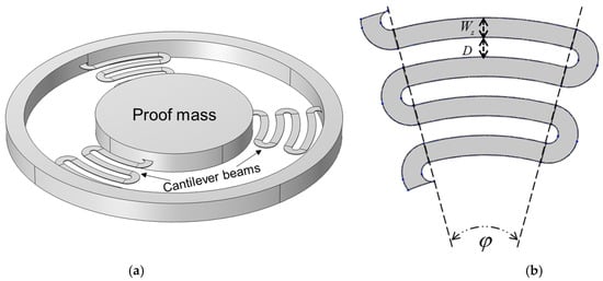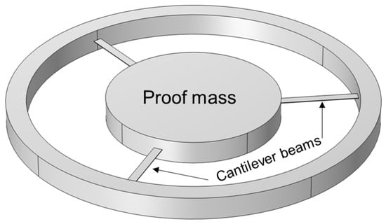 The simplified mechanical structure model with straight-beam cantilevers is shown in Figure 2, which includes three cantilever beams and a cylindrical proof mass. The stiffness , mechanical sensitivity , and resonant frequency of the three cantilever beams can be expressed as [13]: