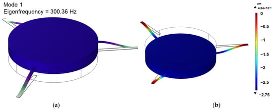 To verify the effectiveness of the simulation, a finite element simulation was used to establish a simulation model of the silicon-based straight-beam cantilever mechanical structure. The simulation parameters are shown in Table 1. The displacement change in the structure under a gravitational acceleration of 1 g was calculated, and the simulation results are shown in Figure 4. Figure 4a indicates that the simulated resonant frequency of the straight-beam cantilever mechanical structure is 300.36 Hz, which is consistent with the result calculated by Equation (4). Figure 4b shows that the displacement of the mass block changes by 2.75 μm under a gravitational acceleration of 1 g, resulting in a mechanical sensitivity of the cantilever beam of 2.75 μm/g, which aligns with the calculation from Equation (3). The consistency between the finite element simulation and the theoretical calculation results confirms the validity of subsequent simulations.