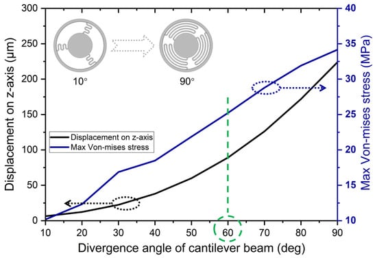 Curves of the maximum displacement along the z-axis and maximum stress versus divergence angle of cantilever beam.