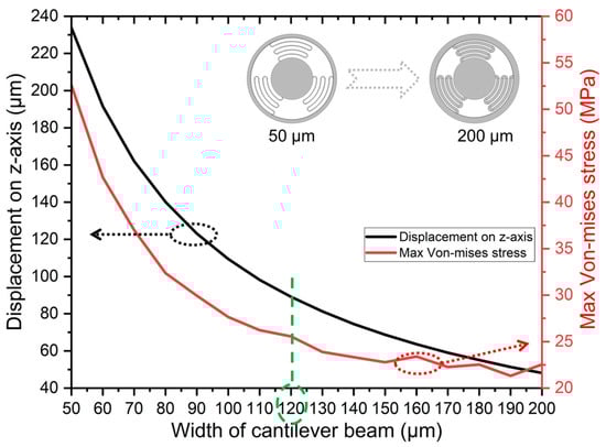 Then, the optimization focused on the width of the cantilever beam. The simulation results of the cantilever beam width ranging from 50 μm to 200 μm are shown in Figure 6. Figure 6 shows that as the width of the cantilever beam increases, both the mechanical sensitivity and the maximum stress decrease. Considering that the target for the maximum stress design is around 25 MPa, the width of the cantilever beam was designed to be 120 μm.