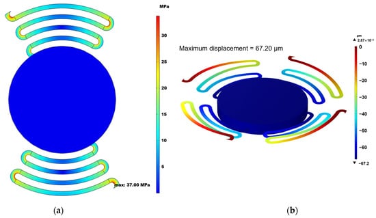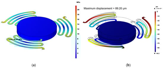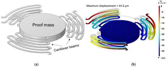 (a) Stress nephogram and (b) displacement nephogram of the proposed mechanical structure under 1 g acceleration in the sensitive axis.