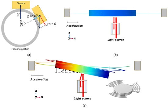 Cross-axis sensitivity is a crucial factor affecting the performance of vibration sensors used in oil and gas pipelines. Considering the actual installation status of vibration sensors on cylindrical pipelines, as shown in Figure 9a, when the installation angles of the vibration sensors are 0°, 30°, 90°, 150°, and 180°, respectively, the corresponding values on the sensitive axis are 1 g, 0.5 g, 0 g, −0.5 g, and −1 g, respectively. In terms of structural design, the key factor influencing cross-axis sensitivity is the relative position between the geometric center of the cantilever beam and the center of the proof mass. For a proof mass with symmetrical cantilever beams, its center of mass coincides with the geometric center of the cantilever beams. In this case, if the proof mass is subjected to acceleration in the cross-axis direction, the optical interferometer can still remain parallel, as shown in Figure 9b. When the cantilever beams are asymmetrically distributed on one side in the vertical direction of the proof mass, the center of gravity of the proof mass will be separated from the geometric center of the cantilever beams. In this situation, if the proof mass is accelerated in the transverse axis direction, the inertial force will generate a torsional moment, causing the reflecting surface of the proof mass to deflect, as shown in Figure 9c. The deflection of the reflecting surface will lead to a reduction in the optical sensitivity of the interferometer, which in turn will degrade the performance of the vibration sensor [19]. Therefore, in order to achieve high-performance operation on pipelines, the fiber FP interferometric vibration sensor needs to have a low cross-axis sensitivity.