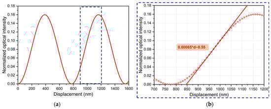 At this point, the sensor operates at its optimal working point. Equation (6) indicates that the maximum optical sensitivity depends on the input optical power, laser wavelength, and the reflectivity of the reflective surface. Given that the reflectivity of the optical fiber end face is approximately 4%, R is taken as 0.04. The laser wavelength is set to 1550 nm, a commonly used wavelength in optical fiber transmission. Using Equation (1), the curve of the interference light intensity of the fiber-optic FP cavity as a function of the cavity length can be derived, as shown in Figure 12a. Fitting the FP interference curve in Figure 12a also allows the optical sensitivity to be determined, as illustrated in Figure 12b. The slope of the fitted line in Figure 12b is 0.00065, indicating a normalized optical sensitivity of 0.065%/nm. Normalized optical sensitivity serves as an alternative theoretical expression of optical sensitivity, particularly useful when the input laser power is undetermined. Since laser power is typically on the order of milliwatts, assuming an input laser power of 1 mW, a normalized optical sensitivity of 0.065%/nm corresponds to an optical sensitivity of 0.65 μW/nm. Thus, the expression for the normalized maximum optical sensitivity, , can be derived as follows: