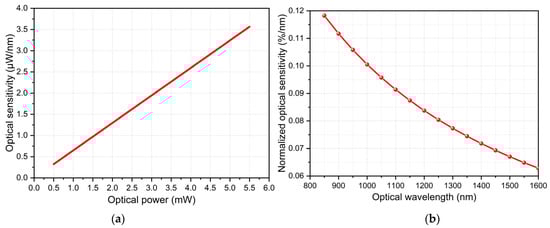 Relationship curves between optical sensitivity and laser parameters: (a) Optical power; (b) Wavelength.