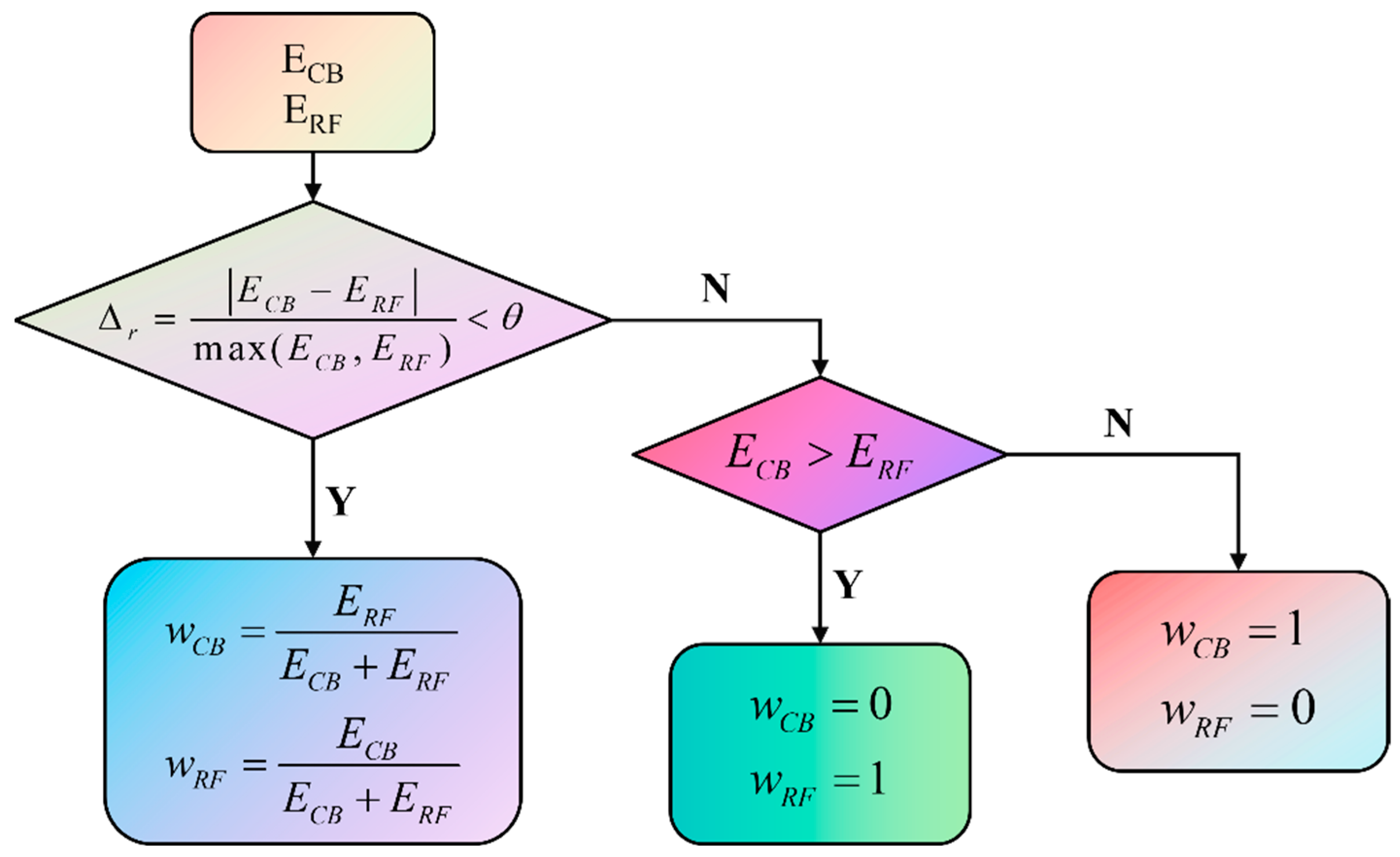 After calculating and , their absolute difference is compared against the threshold . If the difference is less than or equal to , the weights and are allocated proportionally based on the respective errors. Conversely, if the difference exceeds , the model with the smaller error is assigned full weight, effectively disregarding the model with the larger error.