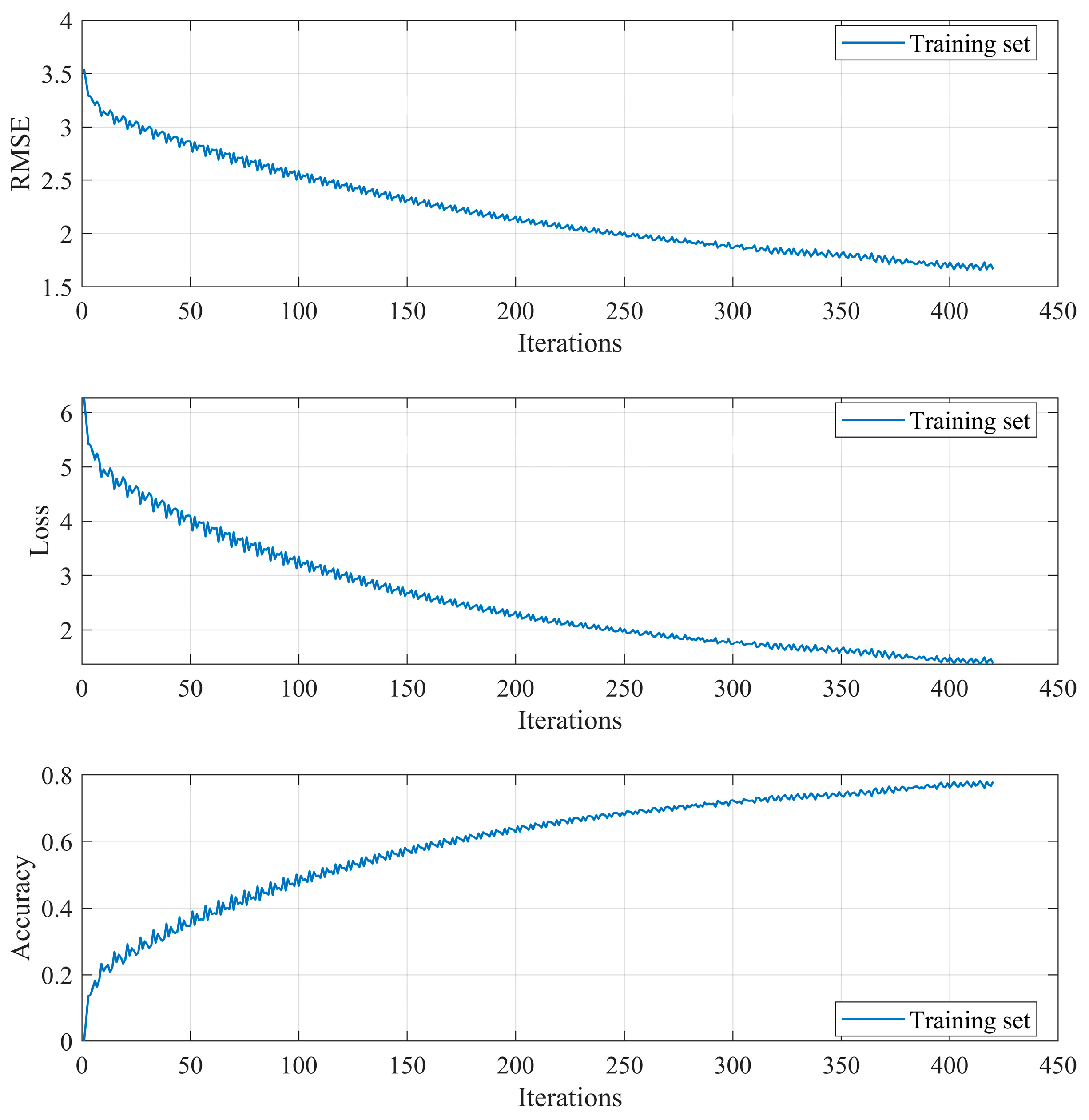 Figure 3 clearly illustrates the key dynamics of the model’s learning process, specifically the evolution of training performance in terms of RMSE, Loss, and Accuracy. The curves demonstrate a favorable convergence behavior throughout training.
