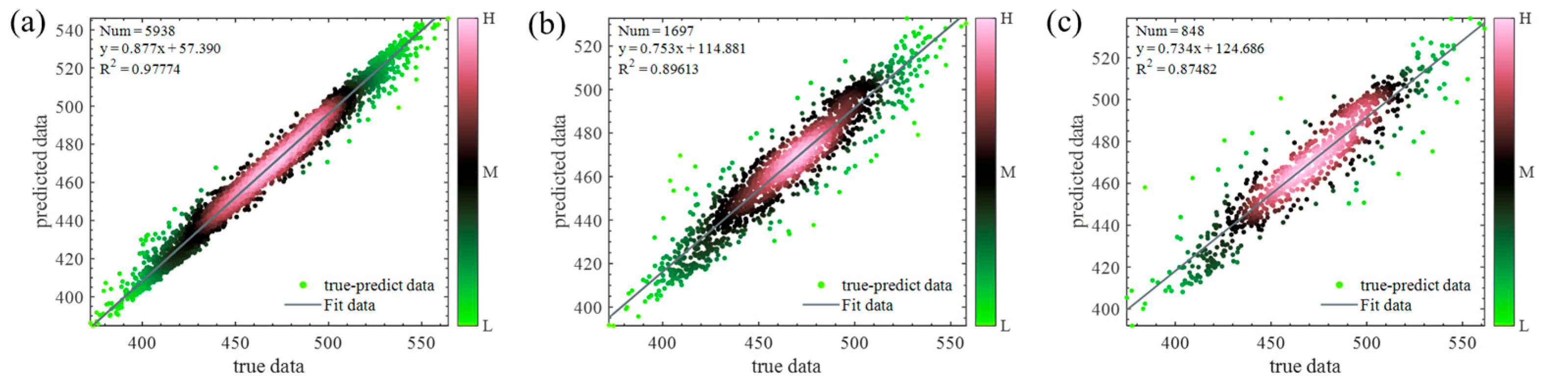 Figure 5b shows the density plot of the validation set, where the data density is slightly lower than that of the training set. In contrast, the fitting performance of the test set (