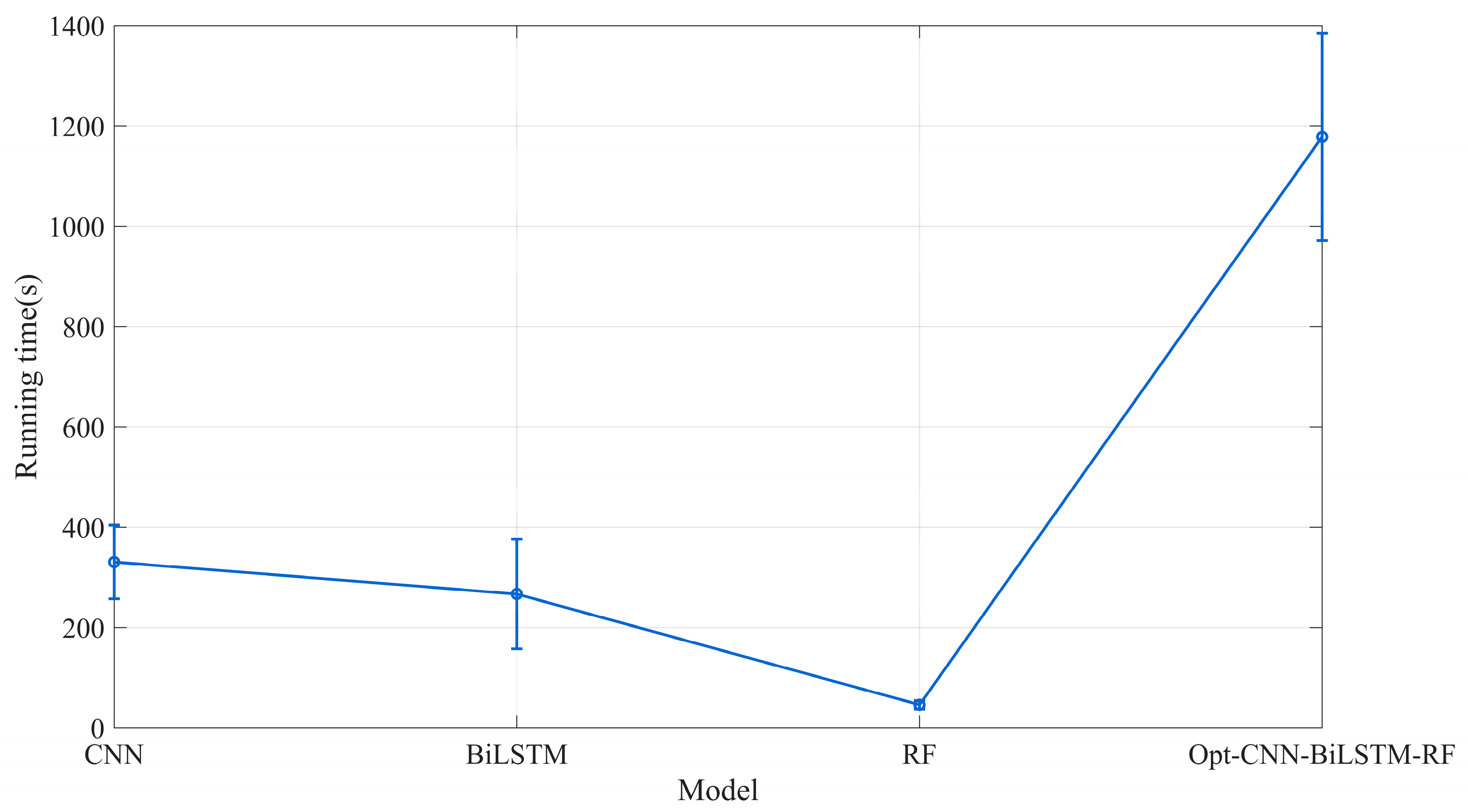 Figure 8 presents a comparison of the average runtime across the four models. The results indicate that the enhanced performance of the hybrid model is accompanied by a notably higher computational overhead. Therefore, model selection requires a deliberate consideration of the trade-off between predictive capability and running efficiency.