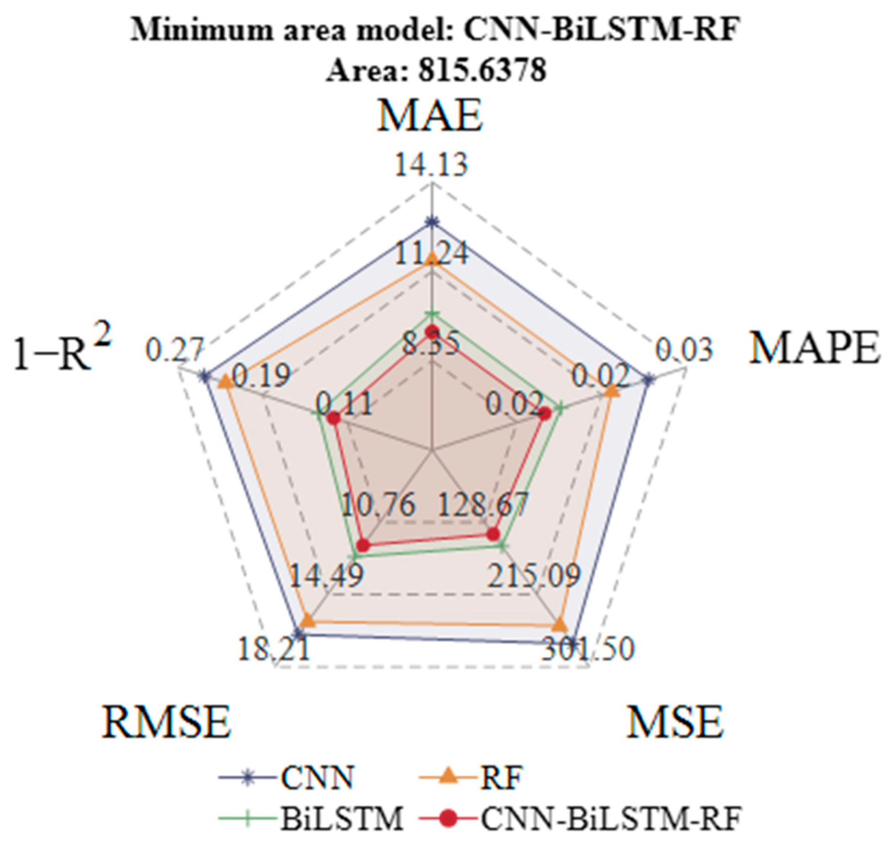 2), where smaller values indicate better performance for all metrics. It can be easily observed from the chart that the performance of each model can be judged by the area enclosed by its metric values. Among all models, the optimized CNN-BiLSTM-RF encloses the smallest area and outperforms the single models in all metrics, confirming its optimal performance. This verifies the effectiveness of the proposed model in time series prediction tasks, as it balances both prediction accuracy and generalizability.