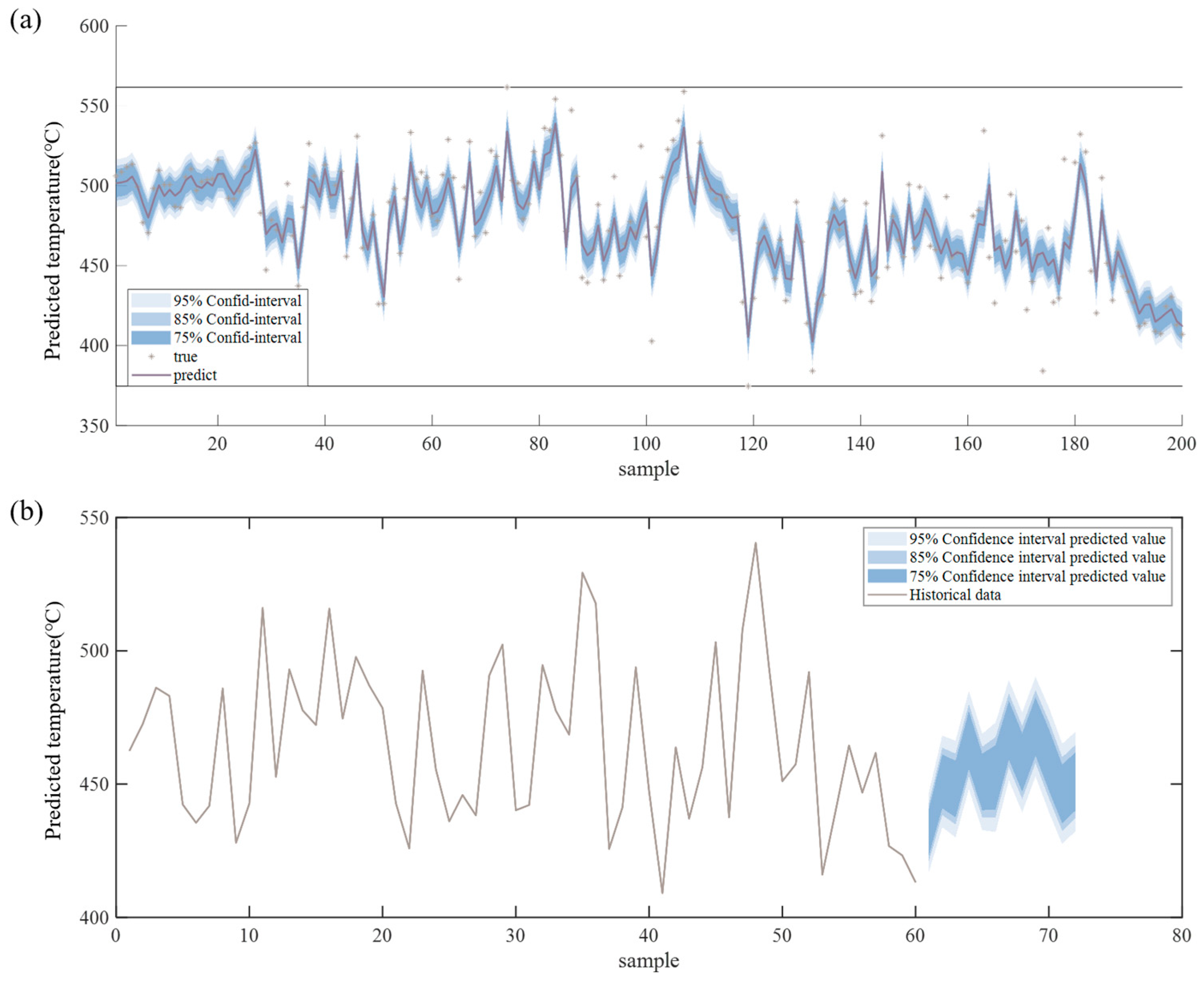 The probabilistic interval forecasts generated in this study can be directly applied to quantify risks in industrial control decisions. For instance, in a kiln temperature control scenario, the predictions with a 95% confidence interval quantify the risk range of “actual temperature deviating from the predicted value.” If the prediction interval encompasses the process-allowed temperature threshold, the associated decision risk is low, and current control parameters can be maintained. Conversely, if the interval exceeds the threshold, control strategies must be adjusted based on the interval’s characteristics—such as increasing the monitoring frequency when the interval is too wide, or preemptively raising the temperature when the lower bound falls below the threshold. This approach provides a quantifiable basis for enhancing the robustness of industrial control systems.
