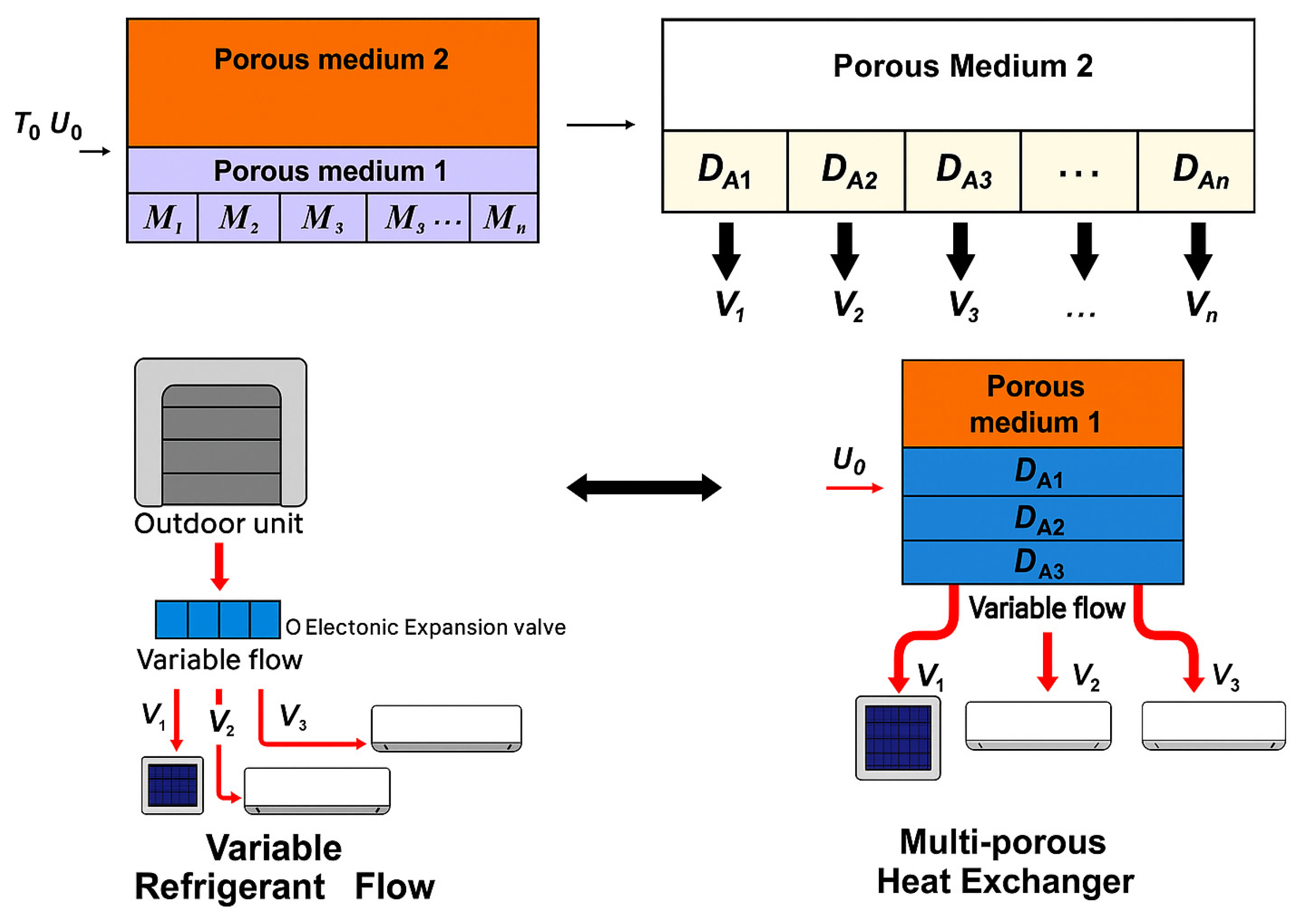 Building on these foundations, this study proposes a novel multi porosity heat exchanger (MPHEX) designed to replicate VRF system behavior through passive material configuration. The MPHEX consists of vertically stacked porous layers, where adjusting the Darcy number of the first porous medium passively modulates refrigerant velocity in the second porous medium, eliminating the need for electronic valves. This passive thermal regulation through structural tuning contrasts with conventional VRF systems, which rely on inverter-driven compressors and electronic expansion valves for active refrigerant flow modulation [