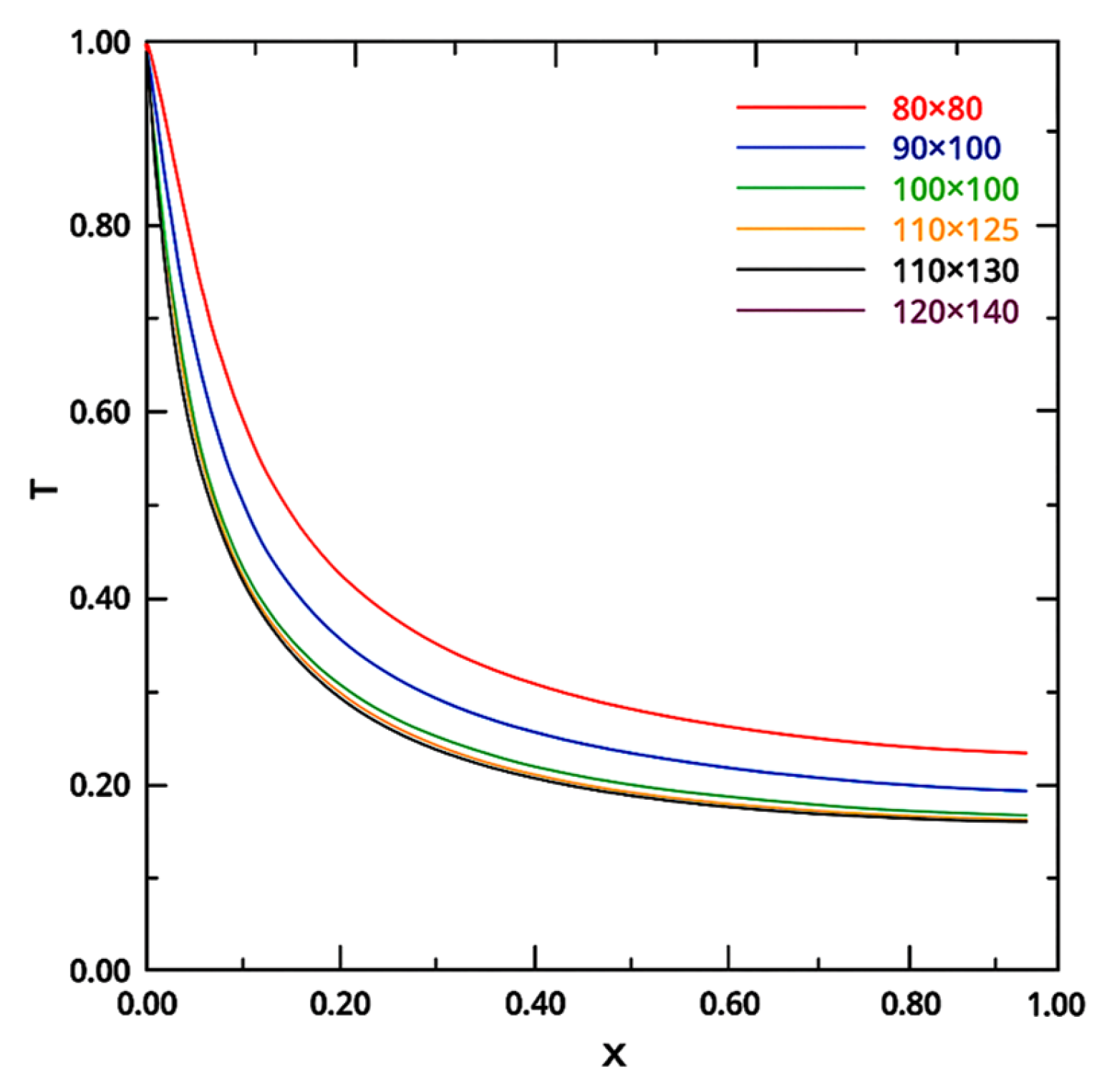 Figure 3 and including 80 × 80, 90 × 100, 100 × 100, 110 × 125, 110 × 130, and 120 × 140, to guarantee the grid independence of the answers. The meshes of 100 × 100 and 110 × 125 were found to differ by a maximum of 0.6%. Additionally, we observed that the U-component velocity is independent of grid size beyond the 110 × 125 grid. In order to achieve the optimal balance between accuracy and computation time, a uniform grid consisting of 110 × 125 elements was selected for all of the calculations shown below. Mesh independence tests with grids from 80 × 80 up to 120 × 140 elements confirm that a 110 × 125 mesh ensures accurate results with less than 1% deviation, optimizing computational cost without compromising precision.
