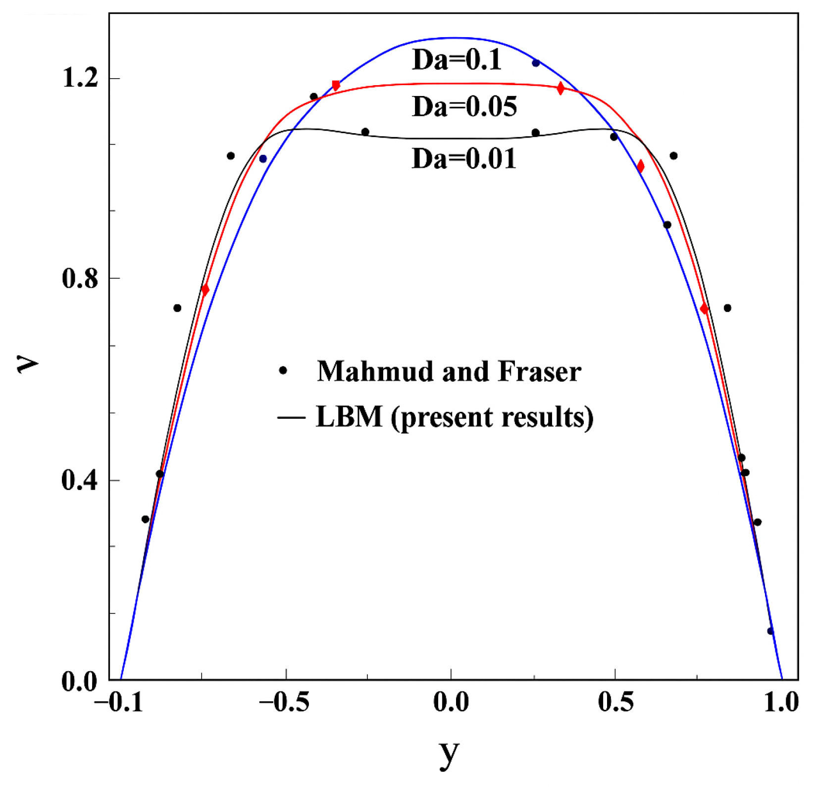 The accuracy of the present LBM code was assessed through a comparison with the analytical and numerical results of Mahmoud and Fraser [