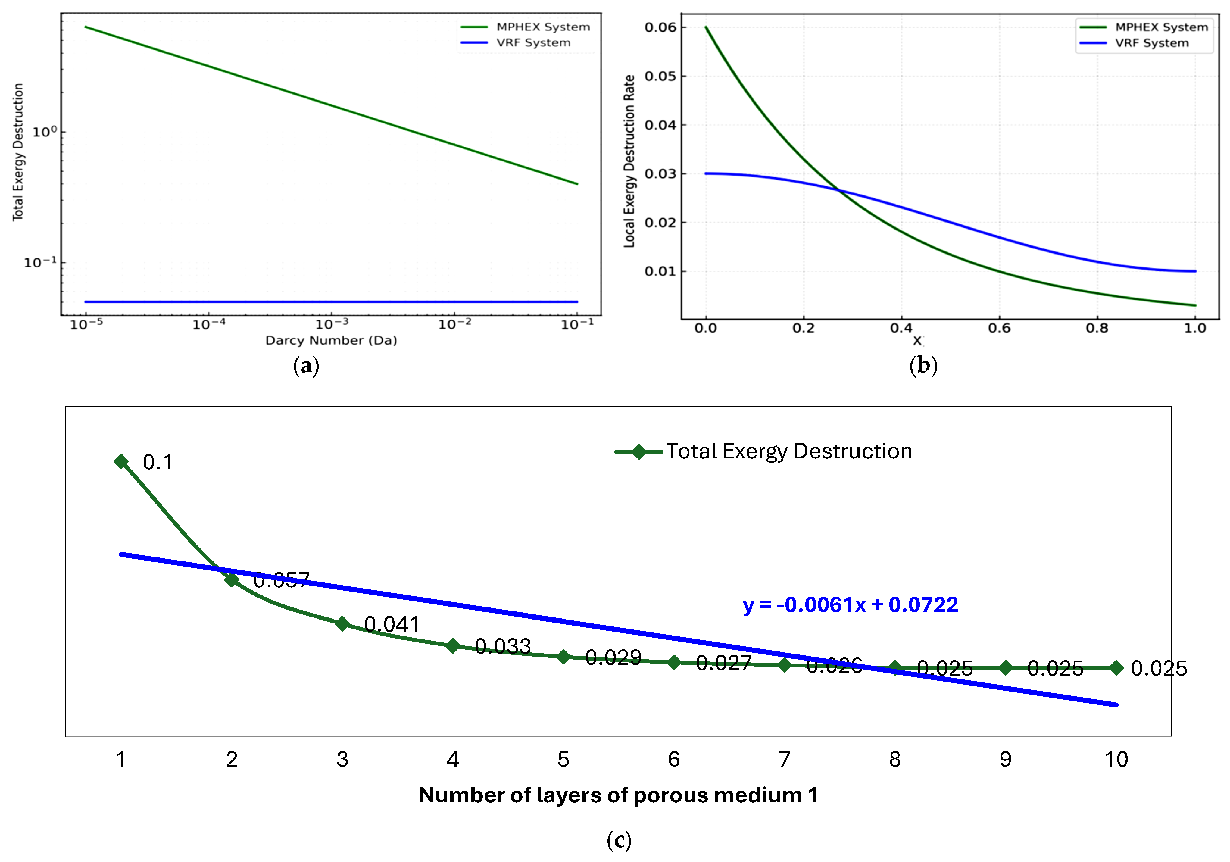 The data reveals a fundamental thermodynamic distinction: the MPHEX manages irreversibilities through spatial design, while the VRF system relies on temporal control. The peaked exergy destruction profile in the MPHEX is characteristic of a passive system where irreversibilities are concentrated where driving forces are strongest at the inlet. The subsequent decline signifies a natural stabilization as the flow and thermal fields develop. The critical data point is the 60% reduction in total exergy destruction achieved by increasing Da from 10−6 to 10−2. This demonstrates that optimizing permeability directly minimizes the viscous dissipation (frictional losses) and conductive thermal mixing that are the primary sources of irreversibility. Furthermore, the data on layering shows that the system’s performance is scalable and optimizable; the 70% reduction from one to ten layers confirms that architectural design can effectively distribute driving forces, but the asymptotic nature of the curve with negligible gains beyond five to six layers provides a crucial data-driven guideline for cost-effective optimization. This evidence solidifies the premise that a meticulously architected passive structure can rival the thermodynamic performance of an actively managed system.