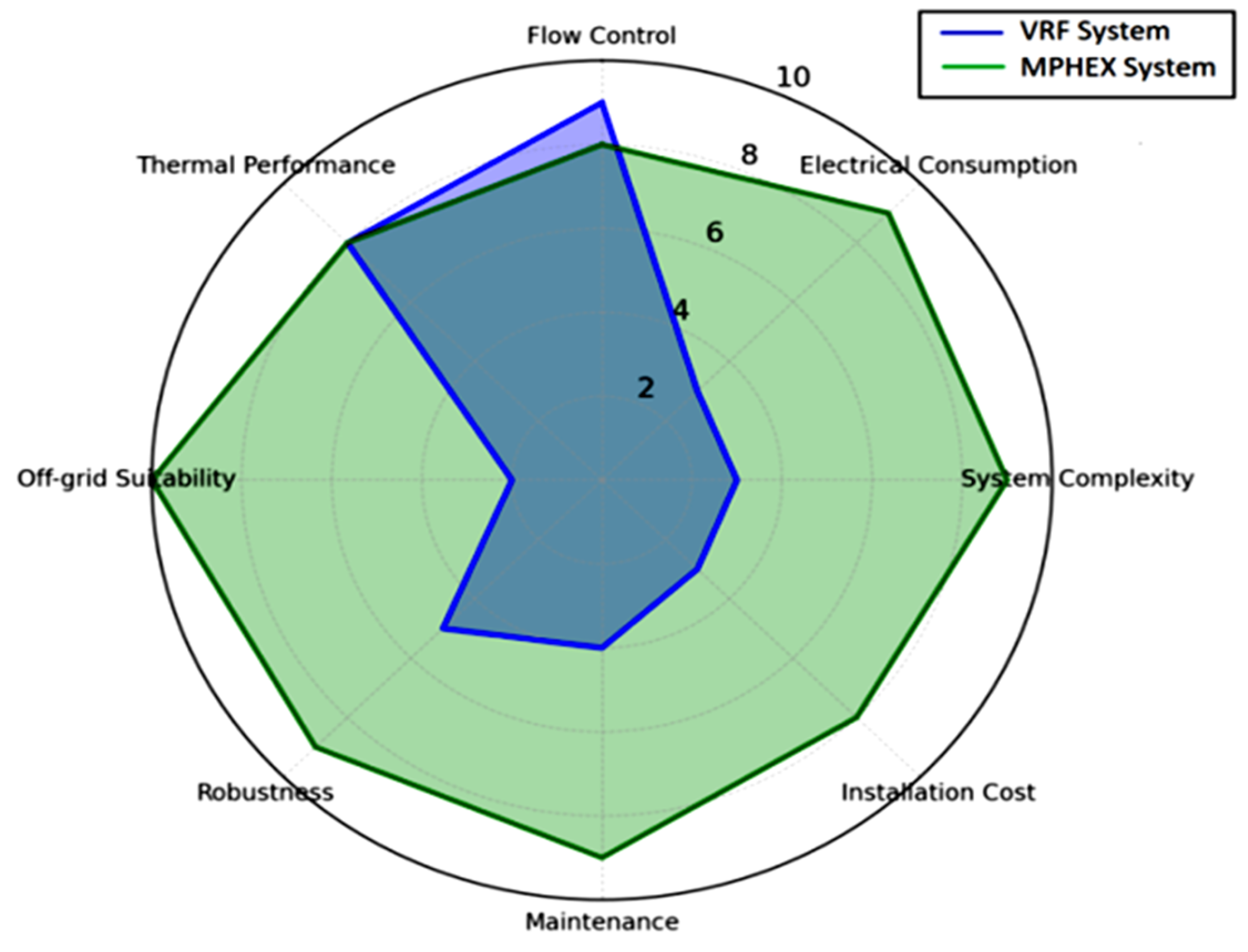 48] who highlighted similar trades between energy efficiency and control precision in VRF systems. Although the MPHEX provides a promising passive alternative, conventional VRF systems still outperform it in terms of rapid thermal response, multi-zone temperature control, and detailed electronic regulation. The MPHEX compensates for these limitations by offering a simpler design with lower energy demand and maintenance cost, making it suitable for applications where moderate response time and uniform thermal distribution are acceptable.