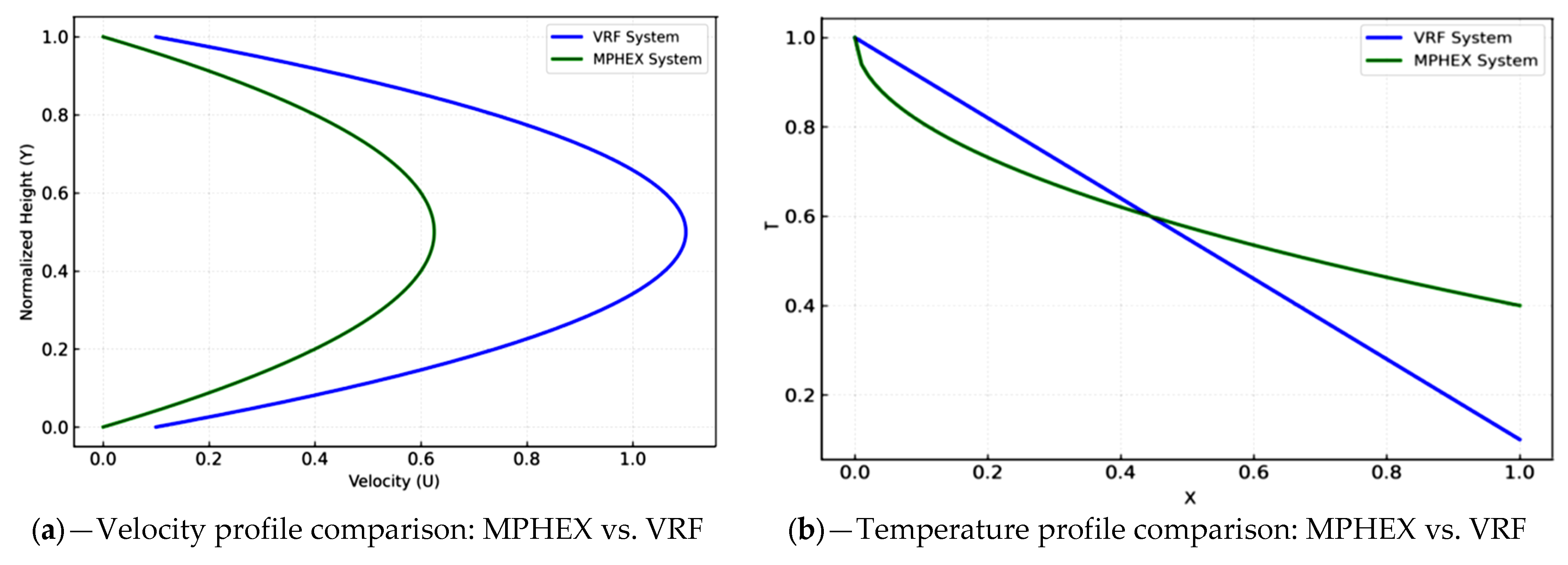 46]. While those studies demonstrated that COP stability in VRF systems is achieved through compressor speed control and electronic expansion valves, the present results show that a similar adaptation of flow rate and temperature uniformity can be passively reproduced in the MPHEX by tuning the permeability distribution. In both cases, the improvement in COP and reduction in exergy destruction are driven by the same underlying thermodynamic mechanism optimized refrigerant distribution and reduced thermal gradients but achieved here through material configuration rather than electronic control. This correspondence confirms that the MPHEX acts as a structural analogue to the VRF system, reproducing its dynamic regulation capability through passive means.